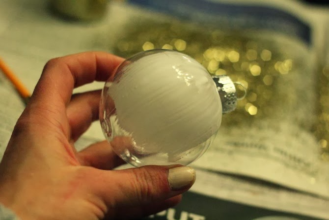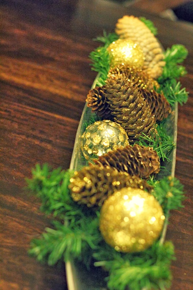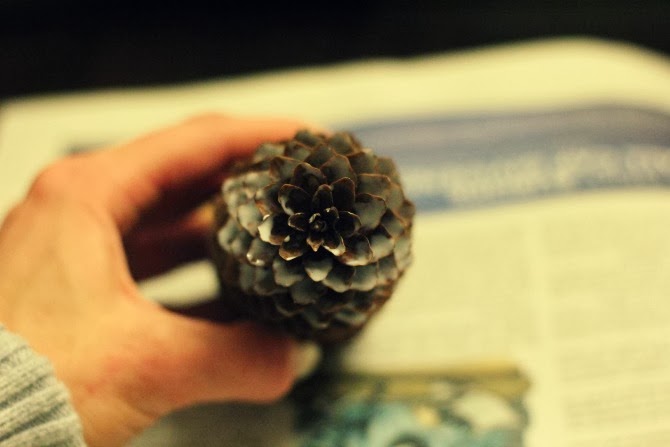 To make the ‘Pottery Barn’ inspired glitter pine cones you need to paint glue on each ‘petal’ (not sure what to call those), after doing a small section, sprinkle glitter on. You don’t want to let the glue dry before putting on the glitter.