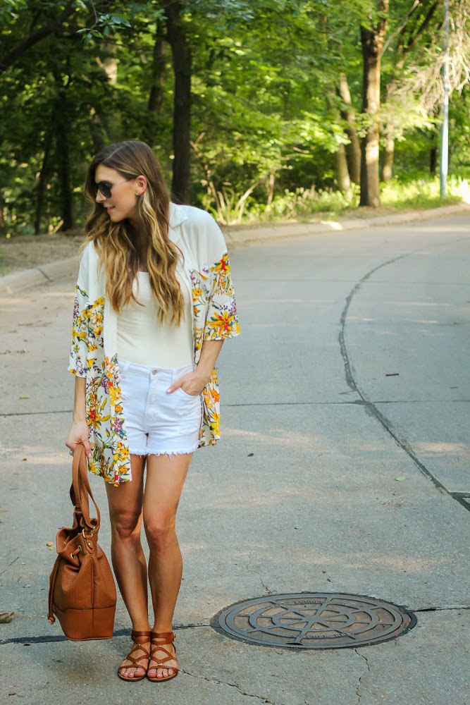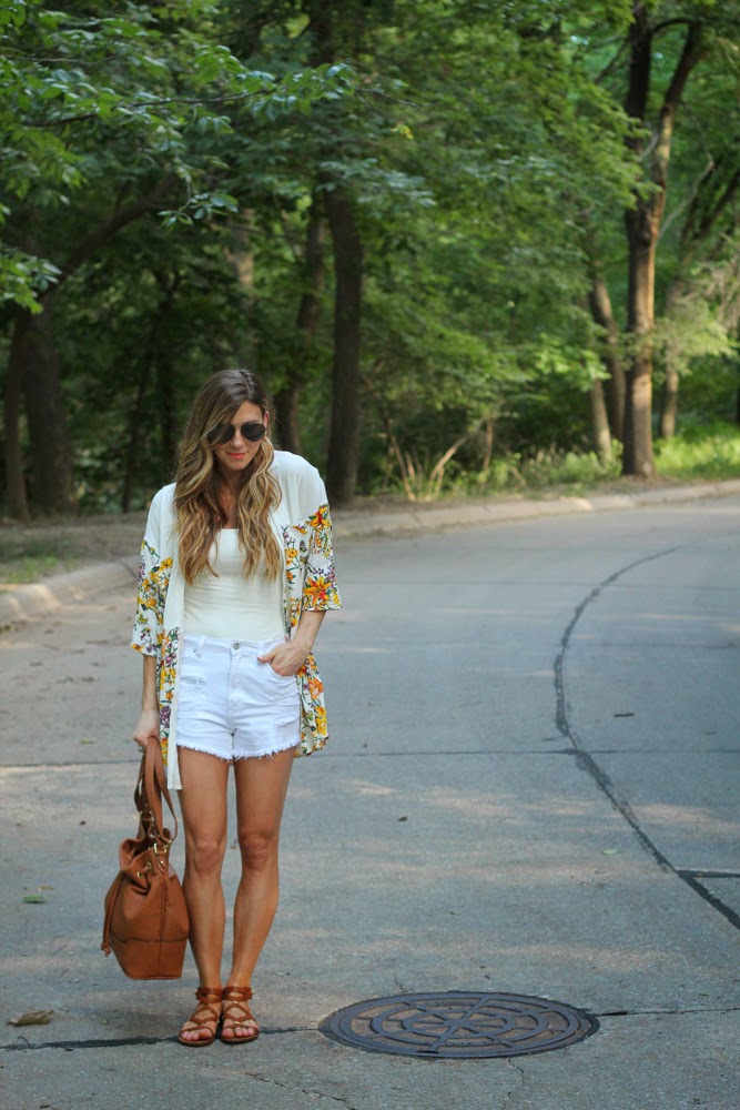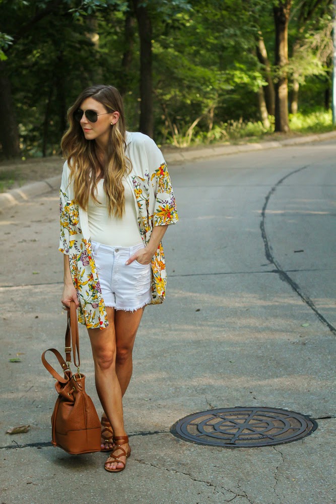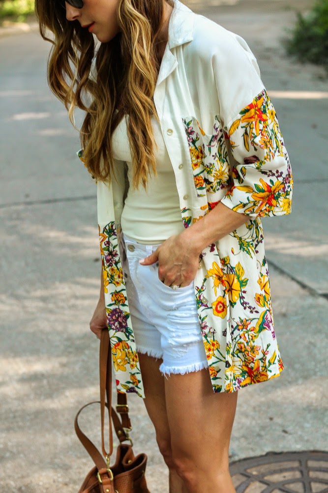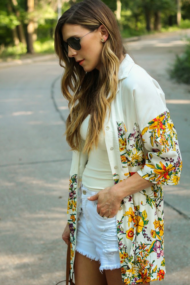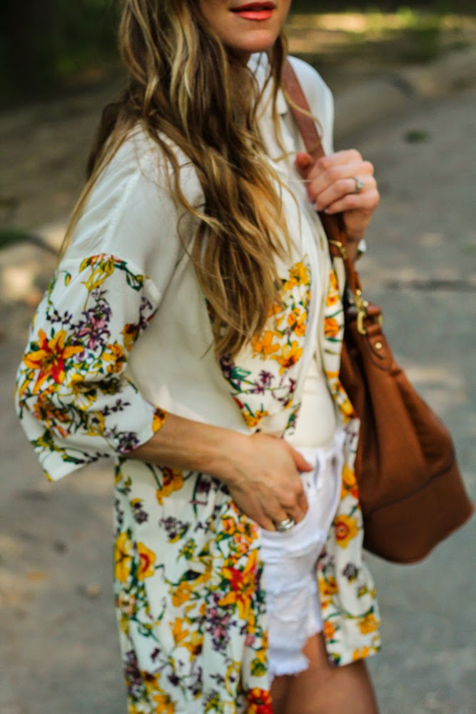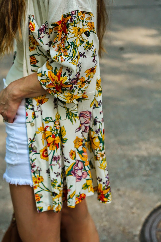 Which brings me to my outfit. We had Sutton’s newborn photos this past Sunday that we had to get ready for, so I had some extra time to get a quick shoot in. Otherwise I have been living in comfy sweats, not leaving the house much, tending to my baby girl. I love this floral print, and the fact it’s an oversized blouse, I can wear it as a dress or kimono style. I paired with some white distressed cutoffs and gladiators.