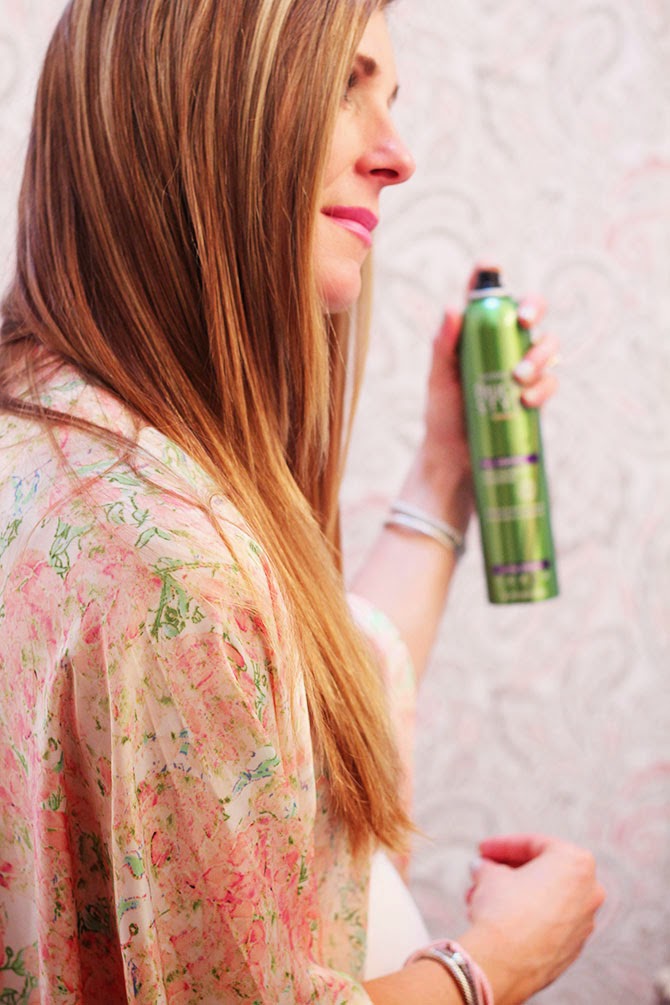 I finished with Garneir Sleek and Shine Anti-Humidity hair spray which provides 24 hour bounce back hold, even in 90% humidity–great for us midwest gals!