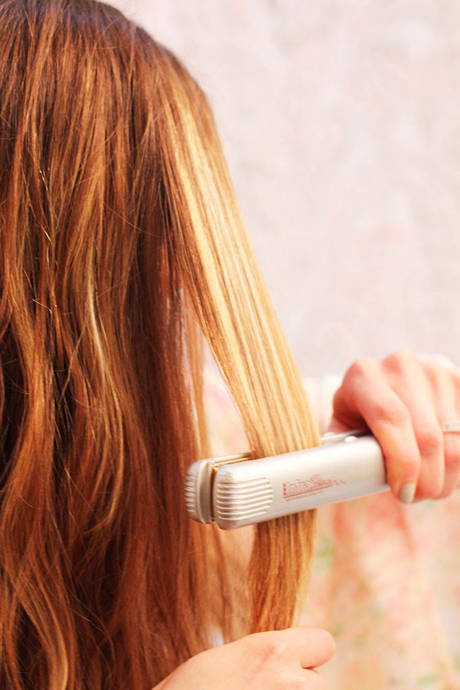 Spray Garnier Sleek and Shine Flat Iron Protector to dry hair by small sections, follow with flat iron.