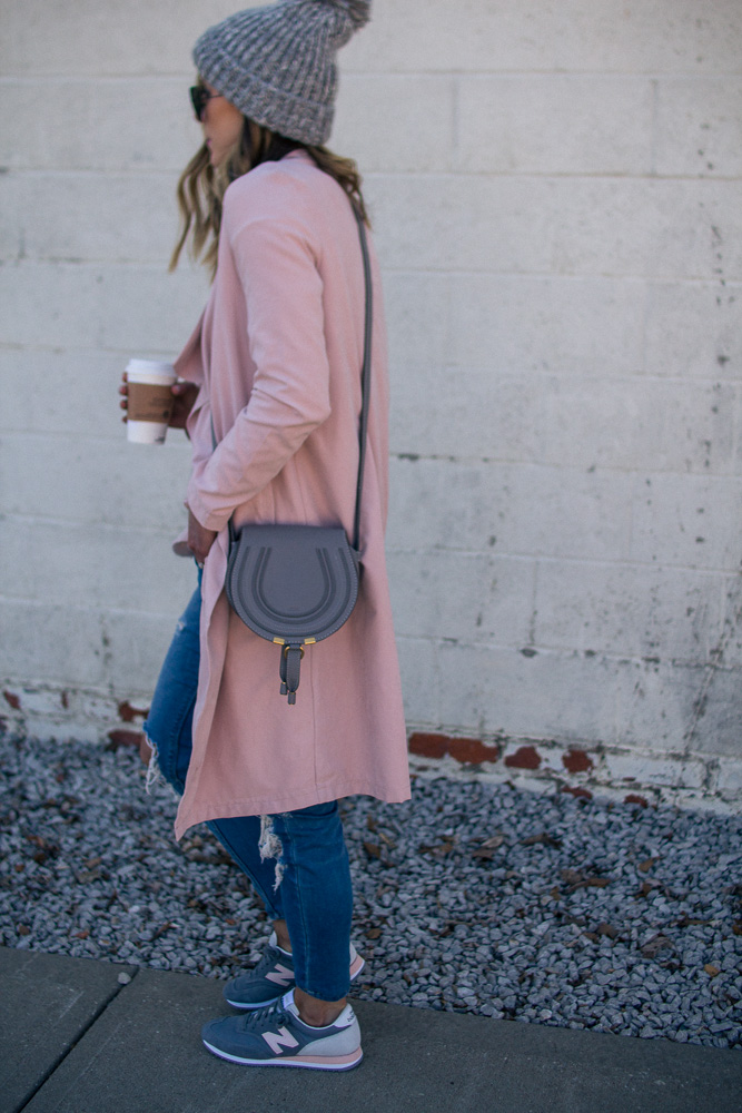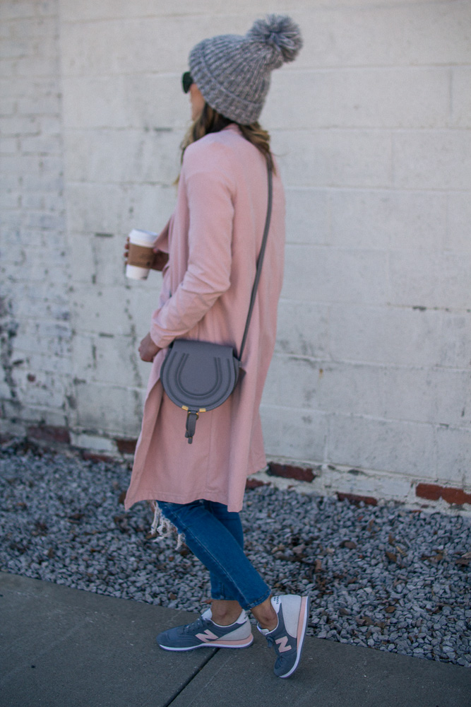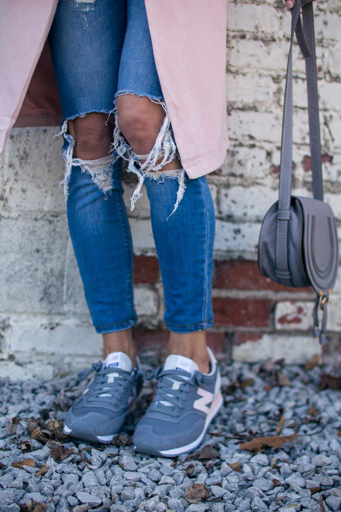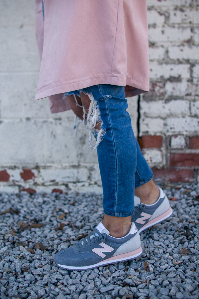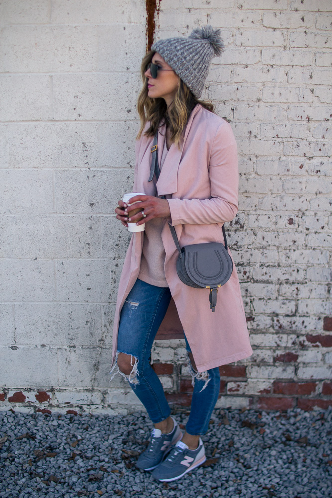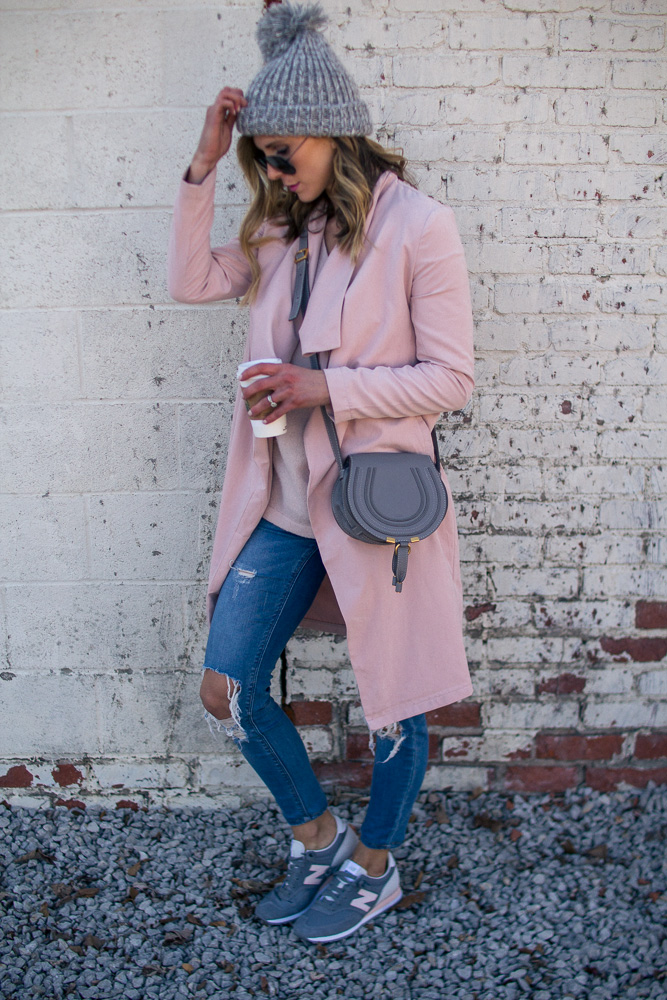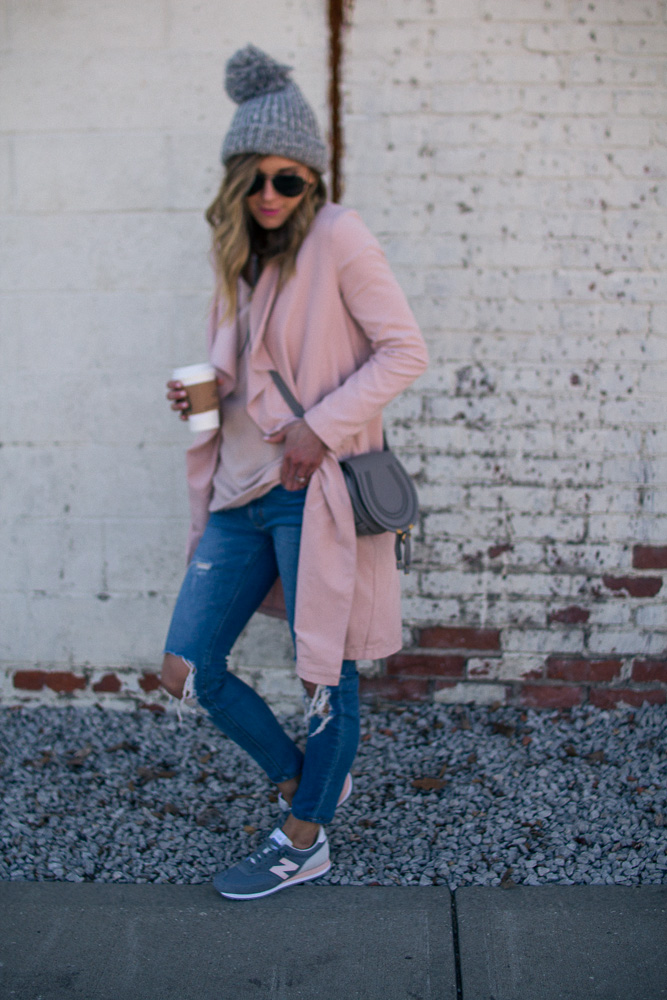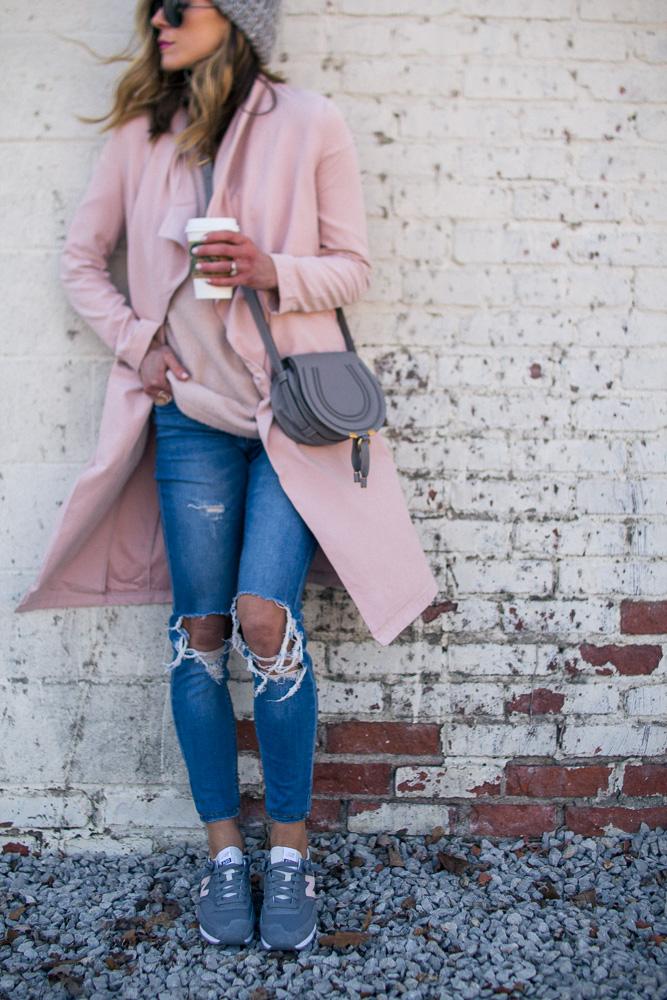 Sharing one of my favorite casual looks. You all know I am sneaker obsessed and New Balance is one of my favorite brands for classic styles. It is very rare to find a pink pair and they ALWAYS sell out so fast. So if you like this pair I suggest getting them now before your size is gone. This draped pink coat is also a favorite and will be on repeat all spring long.
