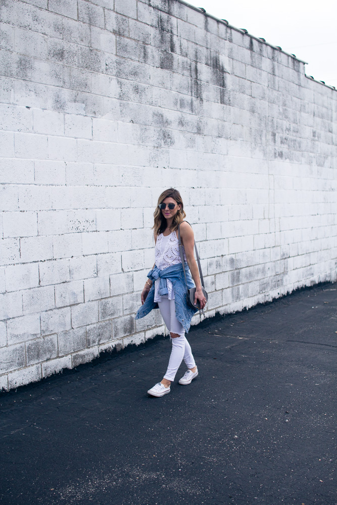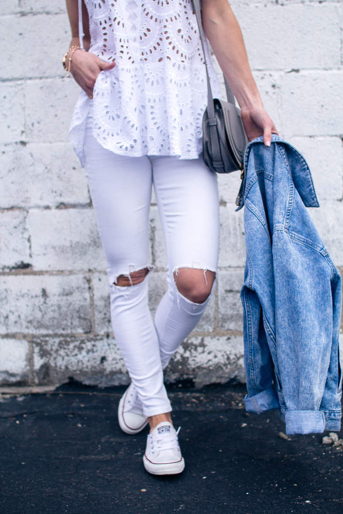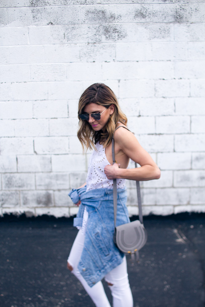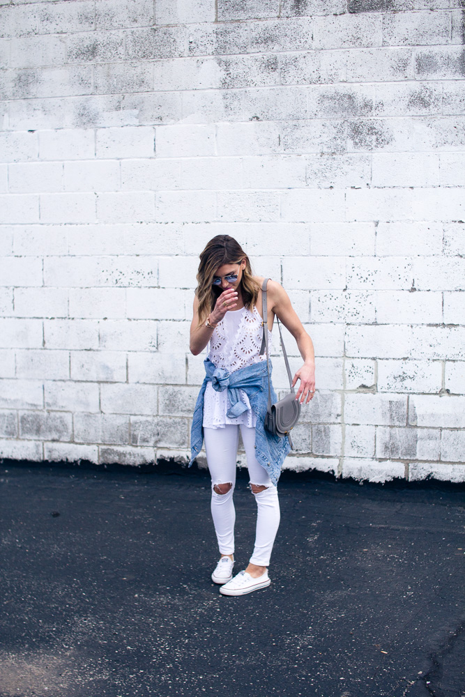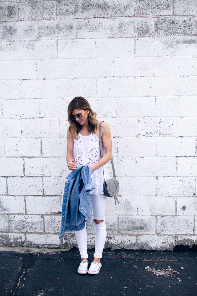 This eyelet tunic I am wearing today, is one of my favorite purchases as of late. The eyelet detail is adorable and it has a ruffle hem. It is super flatter and layers really well. It also comes in black and is selling out fast, so don’t wait if you are wanting to purchase. These jeans have been on repeat lately. If you are needing a new pair of white skinny jeans, I highly recommend these and they are under $100!