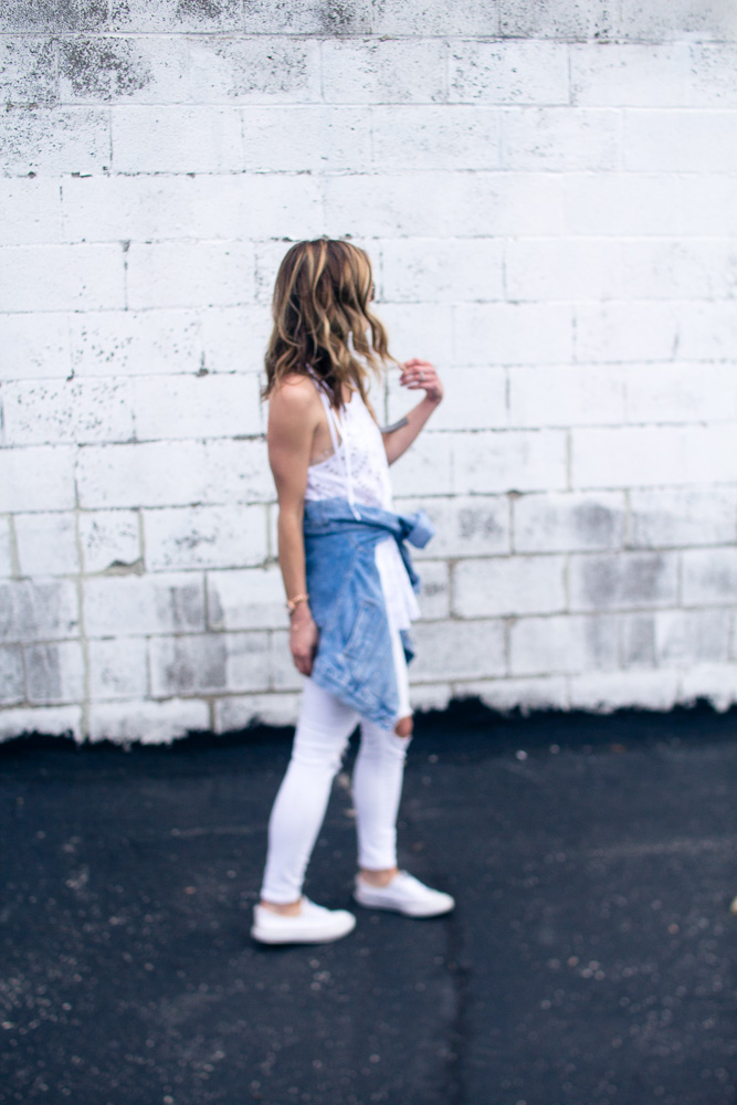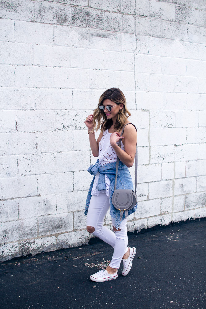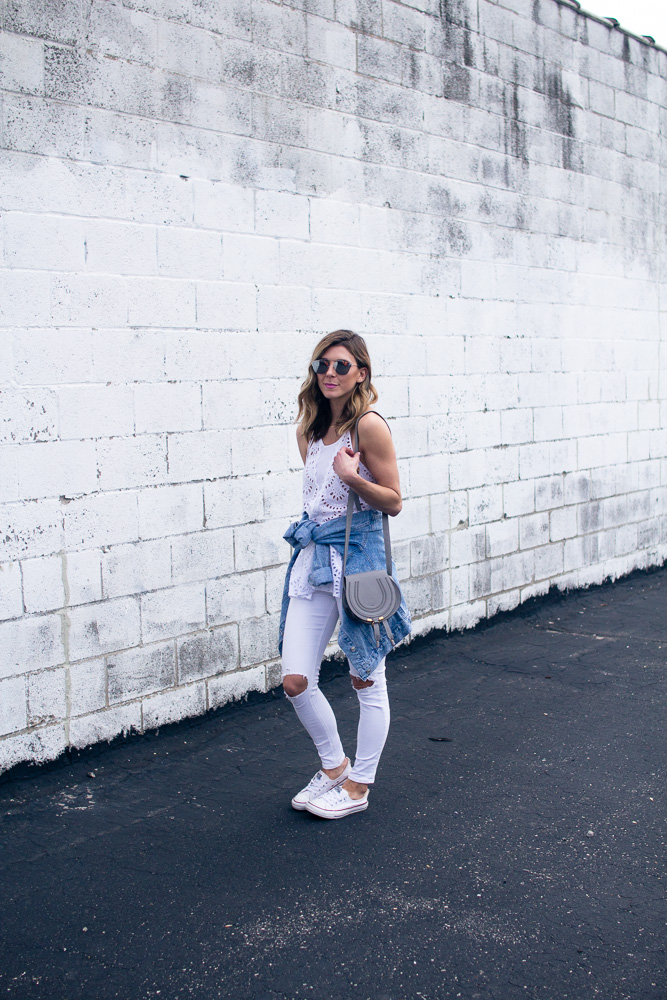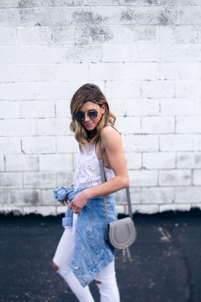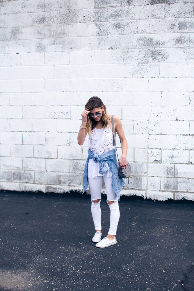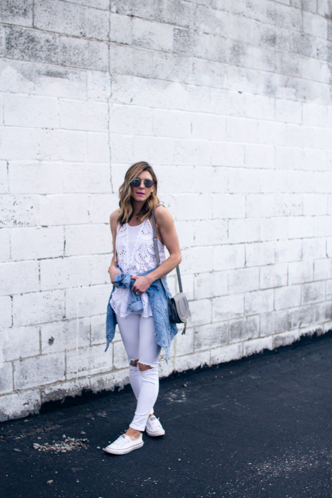 This eyelet tunic I am wearing today, is one of my favorite purchases as of late. The eyelet detail is adorable and it has a ruffle hem. It is super flatter and layers really well. It also comes in black and is selling out fast, so don’t wait if you are wanting to purchase. These jeans have been on repeat lately. If you are needing a new pair of white skinny jeans, I highly recommend these and they are under $100!