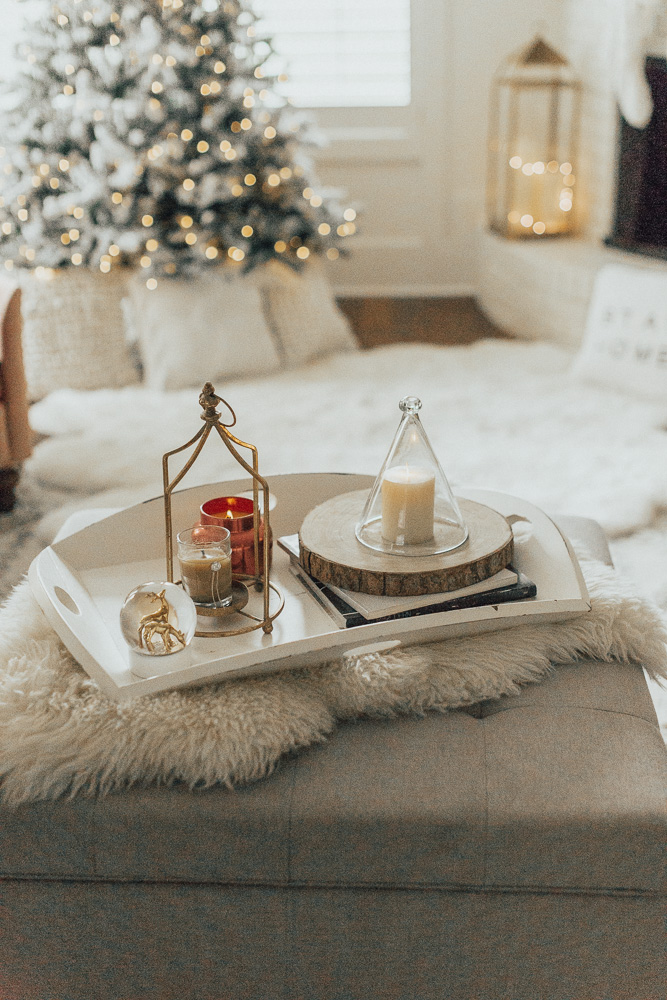 Switch out your decor with a simple Christmas globe and holiday scented candles. Add faux fur shearling rug for an extra dose of cozy.