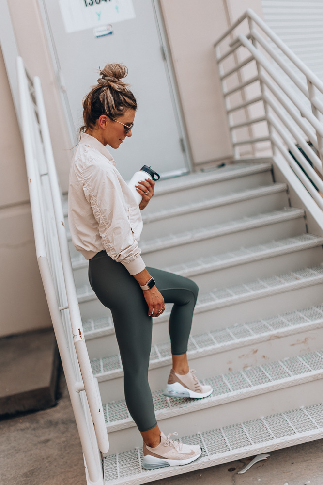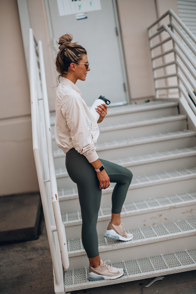 Bomber Jacket TTS wearing size small // Alo Airbrush Leggings TTS (these babies are amazing! I get why they call them airbrush leggings!) // Nike Sneakers (size down half a size) // Apple Watch // Water Bottle