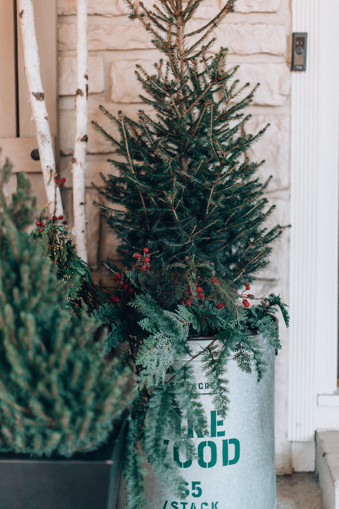 On my front porch I wanted to bring in some real trees & greens. I went to Suburban Lawn (local garden center) to get my trees, bundles of greens, large pinecones & birch logs. The large tree is a Norway Spruce & I placed it in this Galvanized Tree Bucket & a then put a smaller tree (a Dwarf Alberta Spruce) in one my black planters. I used 2 cedar bundles (a pre-bundled mix) & 2 pinecones in my back planter and then added some faux greens & berries as well. There is really no specific technique in placing the bundles & berries, once you start placing the pieces in the planters they start to overlap and hold each other in place. I like the different shades of greens each planter brings & well as the texture & color the berries & pinecones add.