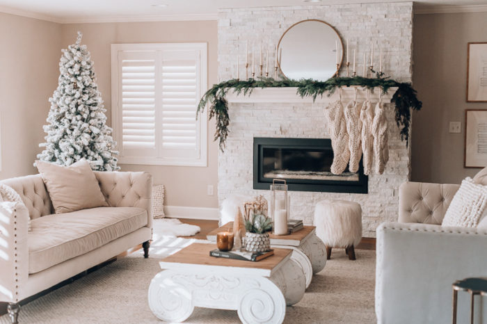 I love decorating our home for the Holidays. It creates such a cozy environment & really gets us in the mood for the Christmas season. Throughout our home I keep the decor pretty simple & neutral with a few big statement pieces like our trees & mantle decor. With 2 young kids it is also necessary for us to not have too many things that can be easily grabbed & pulled — so I let my flocked trees speak for themselves without any ornaments, and I truly love the simplicity of them!