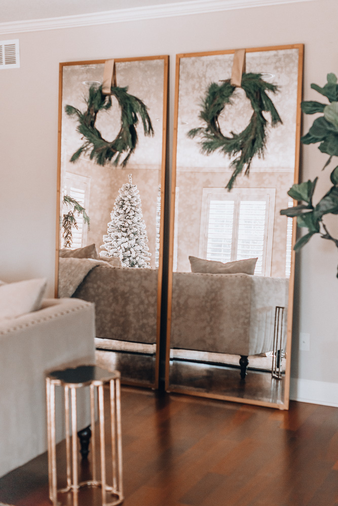 For my 2 mirror wreaths, I bought a 15′ fresh garland from Trader Joe’s & then cut it in half to make 2 wreaths. I simply laid out 2 circles with the garland and then used fishing string to tie it in a few places. The gold ribbon is tied on to part of the wall anchors on the back of the mirrors.