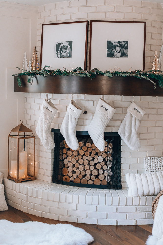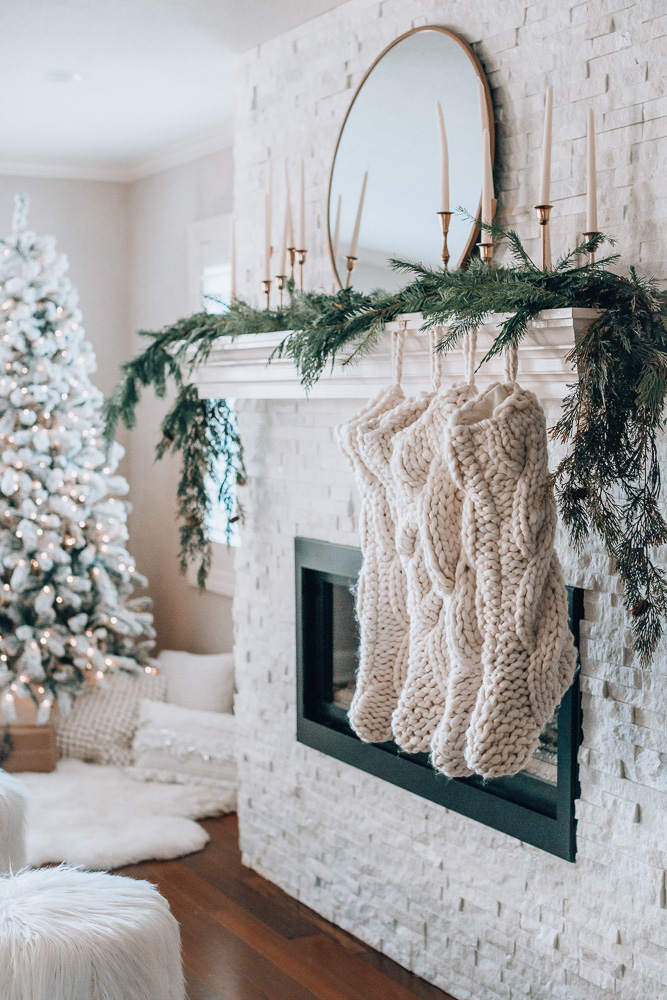 In our more formal living room we took down the TV above the mantle. I was so excited to be able to decorate it without the TV being in the way. I added these candlesticks that I had in my fall decor on my family room mantle and hung these stockings from Crate & Barrel similar here. The garland in here is real from a local floral shop, Flowers by Emily. It is beautifully pieced together!