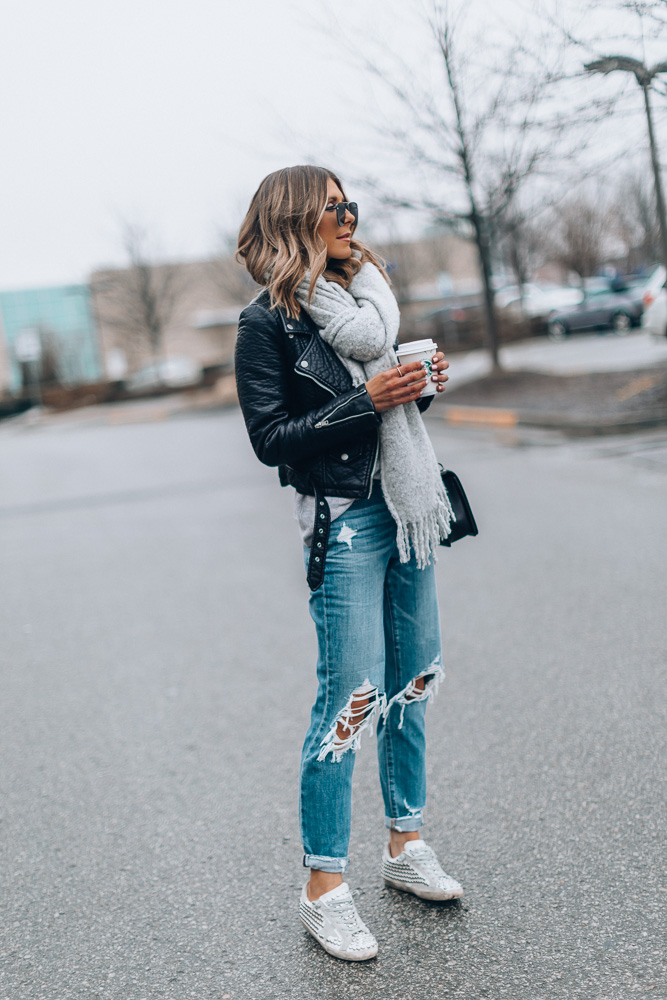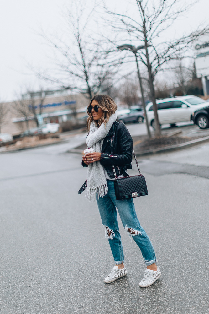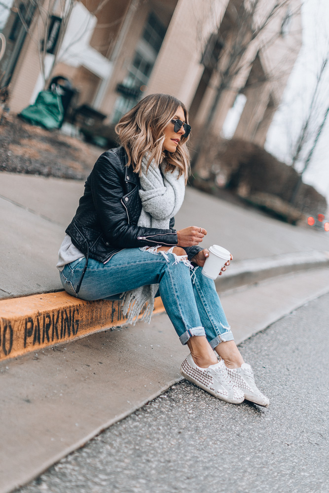 Outfit details: Jeans here (use code: LOVE for 20% off!) and here // Faux Leather Jacket // GG Sneakers // Grey Scarf similar here // Sunglasses (under $80)