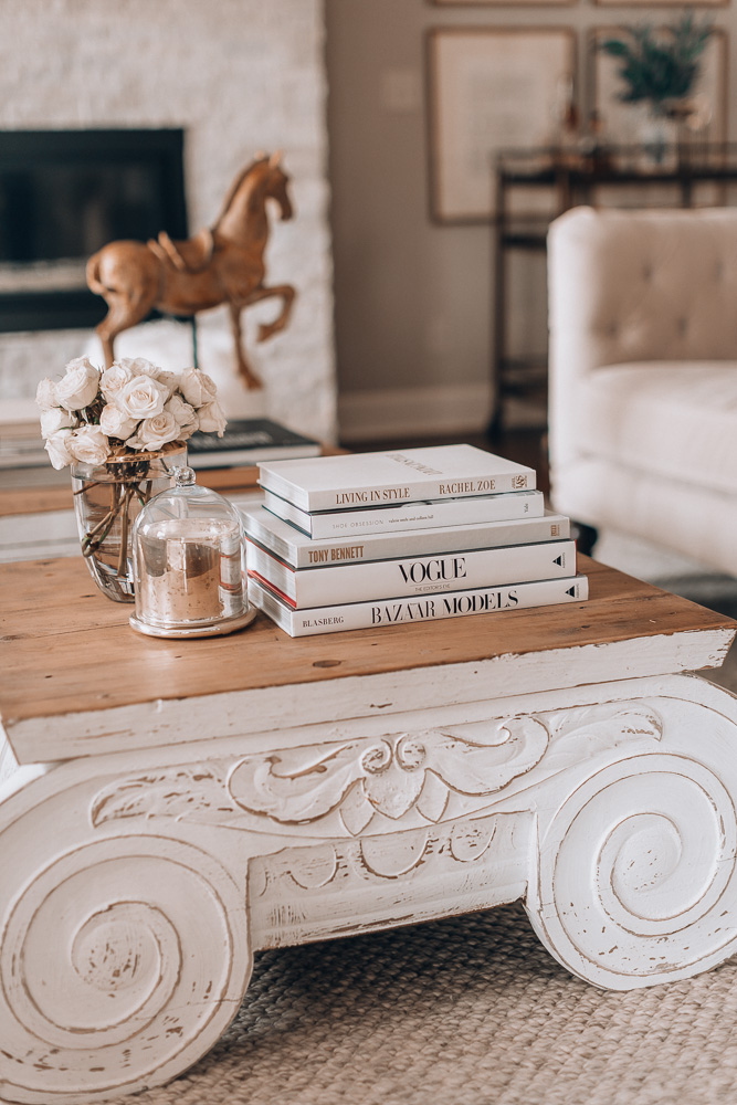 I’ve been collecting coffee table books for awhile and knew they would be a great way to bring in simple clean lines for Spring. Plus, books are a fun way to share your interests. I collect coffee table books about fashion, decorating & travel. When searching for books in those categories I look for neutral covers (or at least the spine). I also look under the outer cover too because if it has a colorful or busy cover, it may have a neutral hard cover. In that case I take off the sleeve to keep a cohesive look.