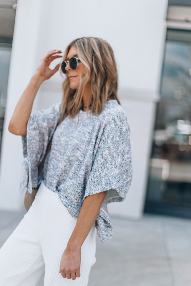 I found this shrunken poncho top and it’s so easy to throw on when I’m on the go and still be chic while wearing something that honestly feels like pajamas. My pants are by the same brand as the top, Lou & Grey, which I’m obviously loving. The ribbed knit and cropped style are very on trend. Then, I layered it all up with this denim jacket. Denim jackets are the key to any spring wardrobe, so I highly recommend picking one up if you don’t already have one.