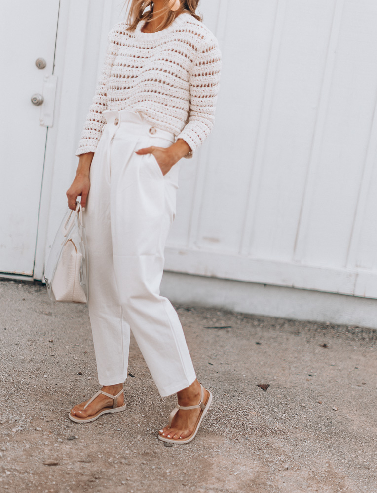 For this look, I chose to really dress the sandals up – another thing I love about them. I could easily wear them with a t-shirt dress and ball cap or something chic like today’s outfit. Staying true to the neutral theme, I went with these white high waisted paper bag pants and this loose knit sweater. Both pieces are perfect for that warm but not hot transitional weather we see so much of this time of year.