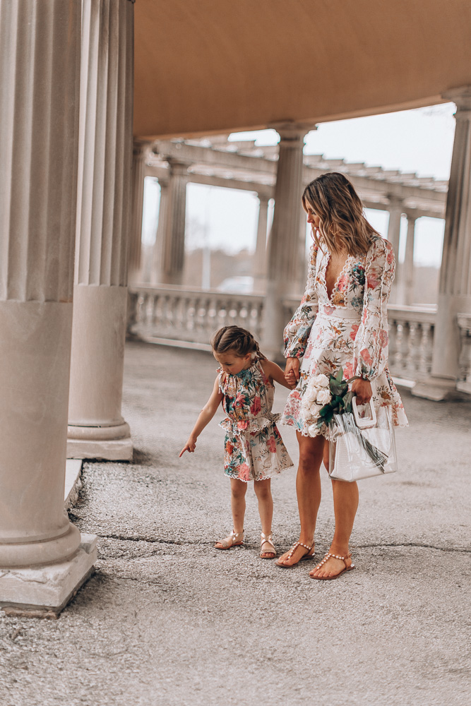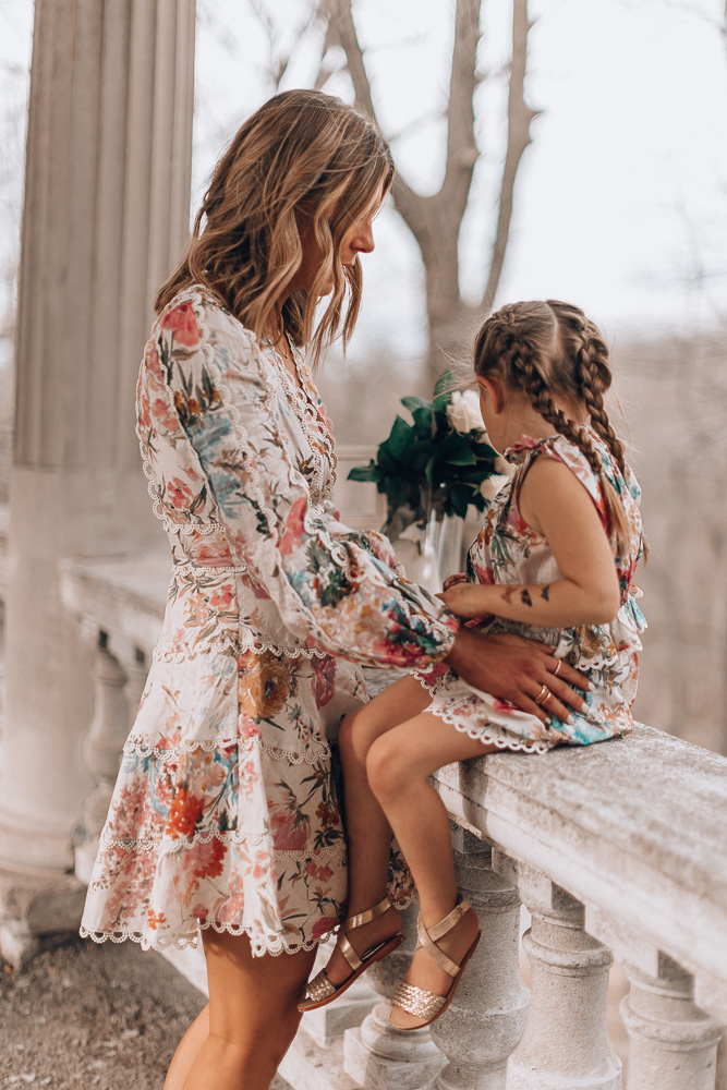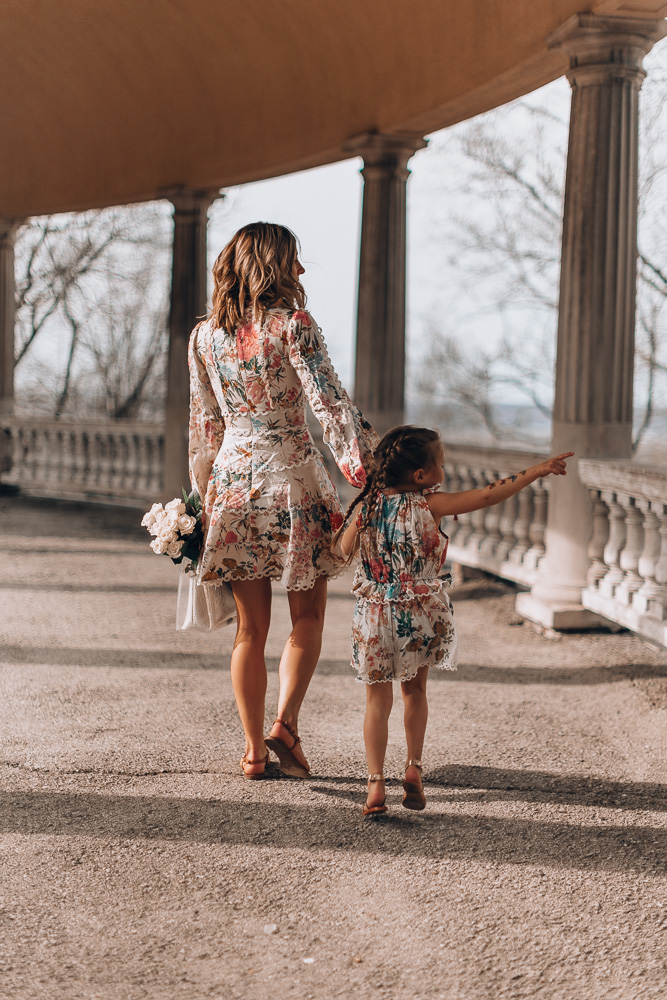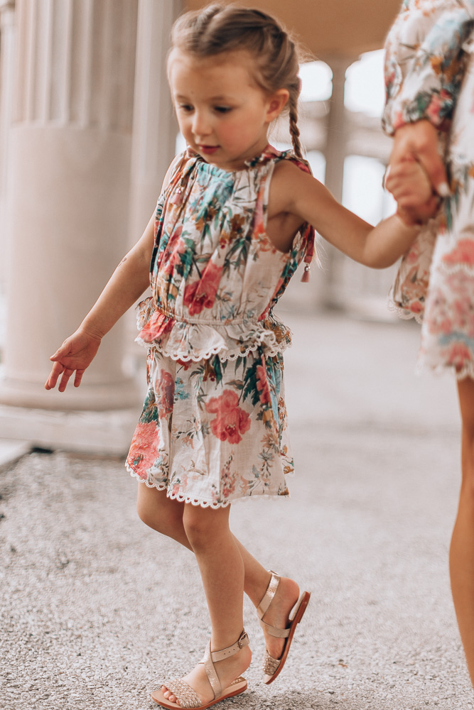 Today, I’m wearing a Zimmerman dress from Mytheresa and found the perfect little romper for Sutton to match. I’ve talked about Mytheresa Kids so many times now – and it’s really because I can grab outfits for the kids and me in one go. Knowing exactly where to shop saves me a lot of time when it comes to coordinating the best outfits for the blog. Plus, I can always get them when I need them.