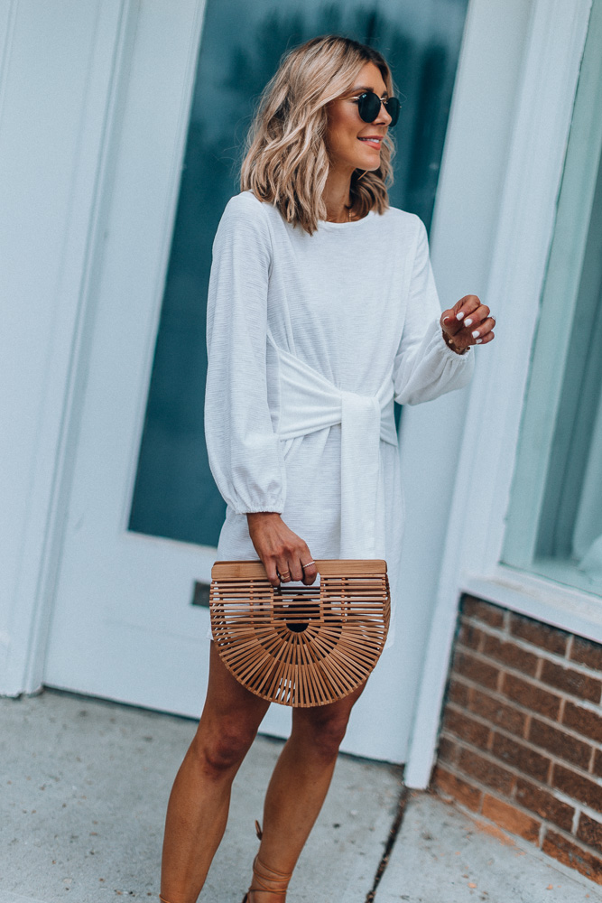 I’m wearing a size medium in this dress! I sized up for the length and you can adjust the tie around the waist which is nice. I’m 5’7″ for reference. The dress comes in 6 colors and I own it in 3!