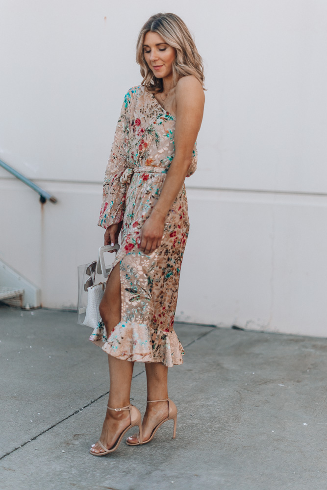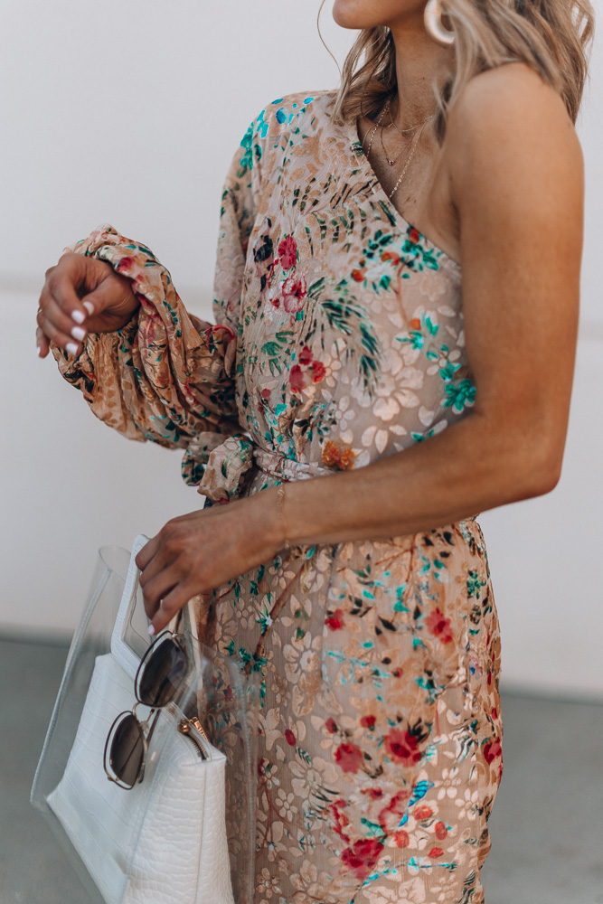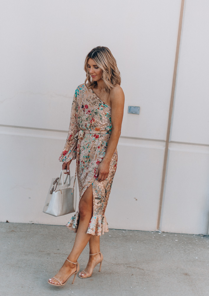 The details on this floral print dress is stunning. I love how beautiful and bright the print is. It’s the perfect dress to stand out in an event like a wedding yet not take away from the bride. I kept accessories simple with my go-to nude heels and gold earrings.