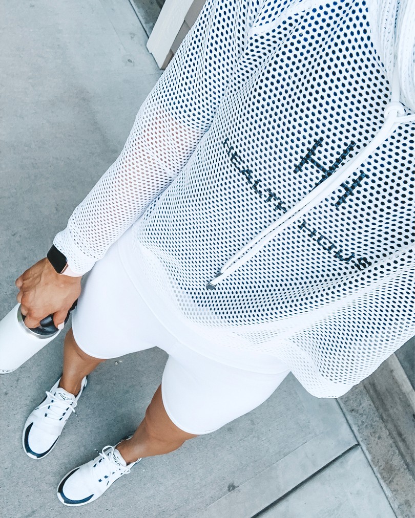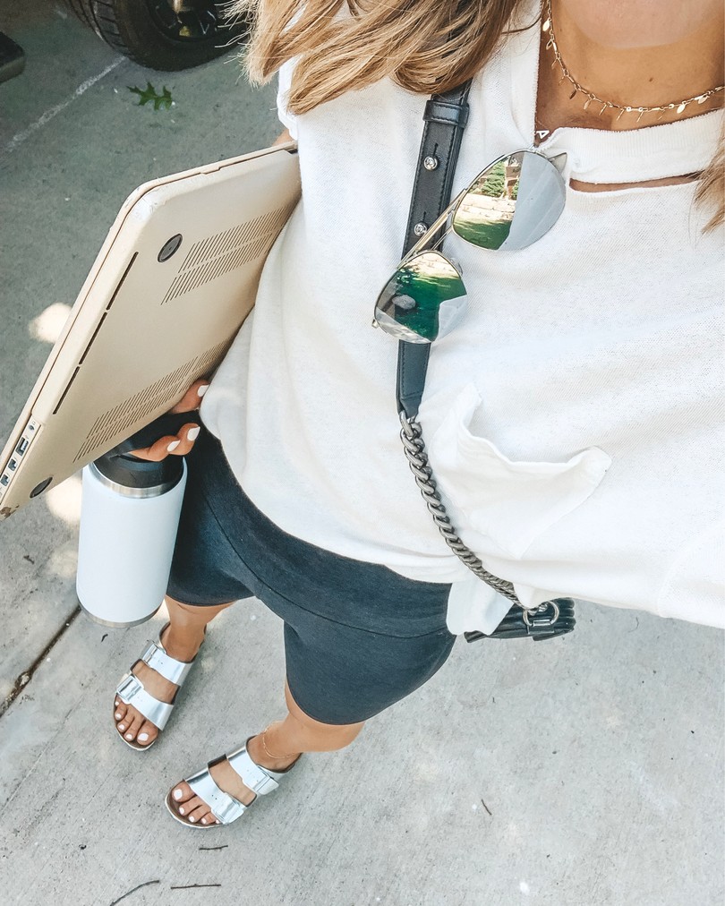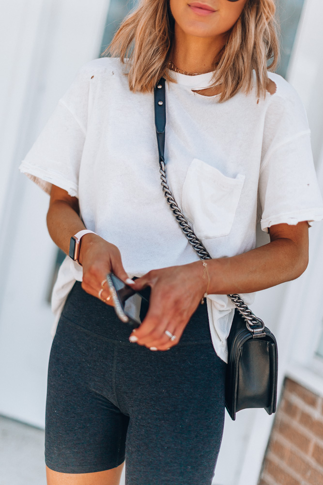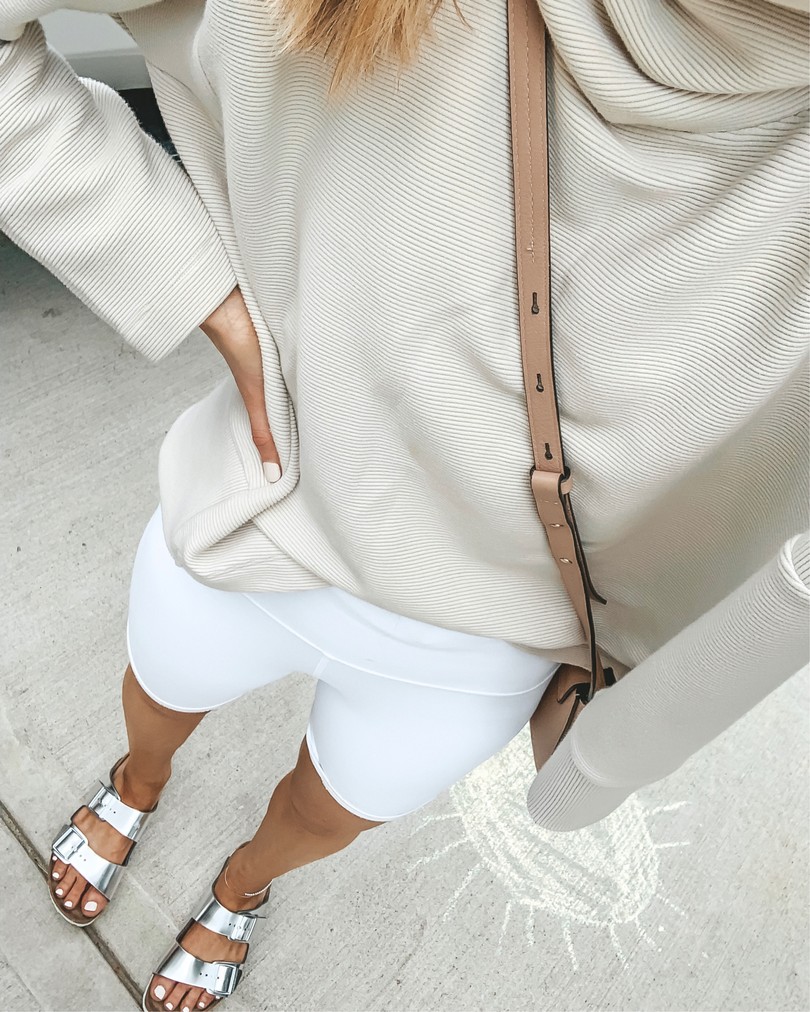 So how do you style biker shorts? In my experience, you can go a few different directions. I’ve loved wearing mine with oversized tees and pullovers, and I really like the look of a monochrome color scheme. For the look in the photos, I’m wearing this pair of shorts from Alo, which I have in black, white and just ordered in tan. Can you tell I’m really into them? I also own a black pair from this brand. If you want to try the biker short trend for under $20, try this pair or this pair.