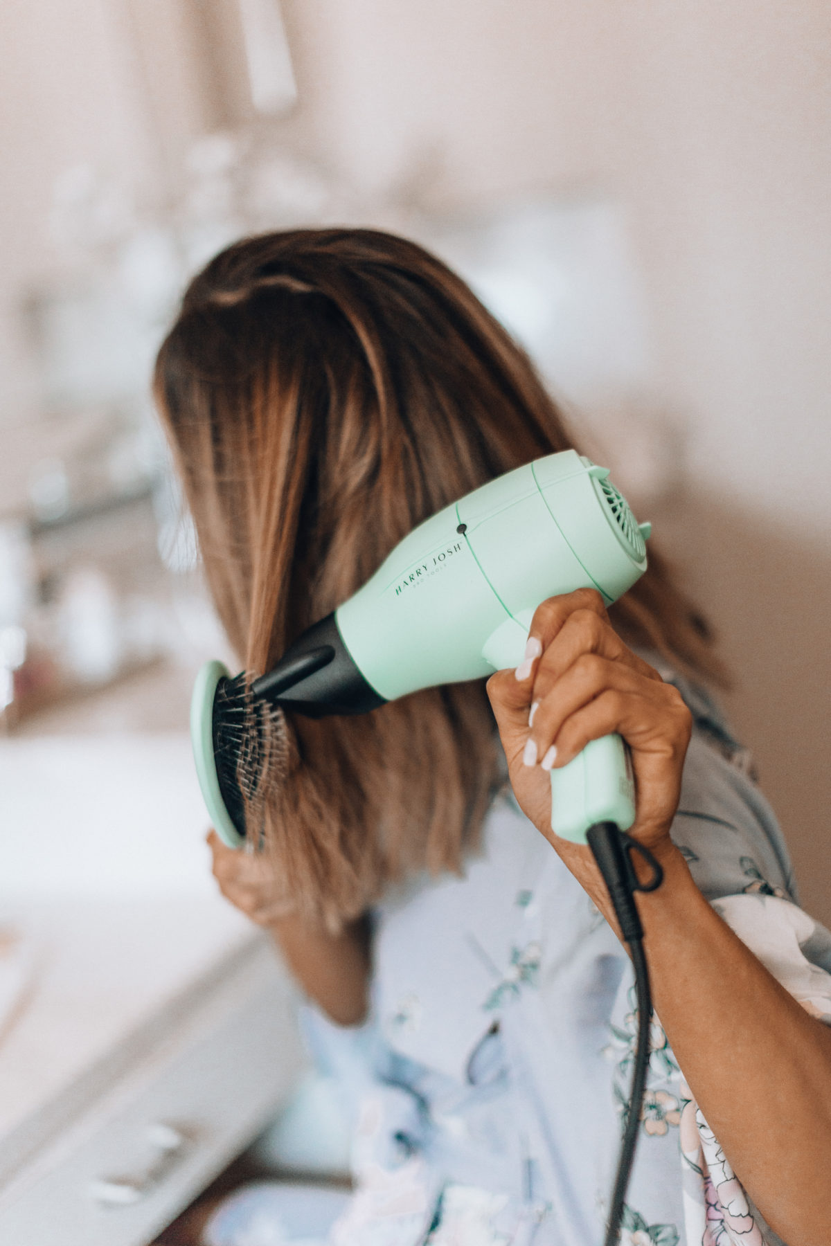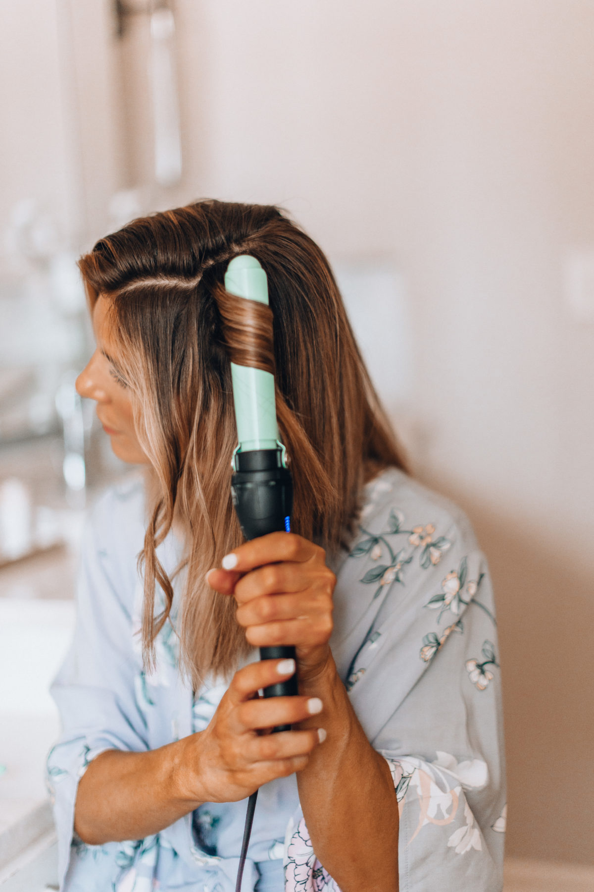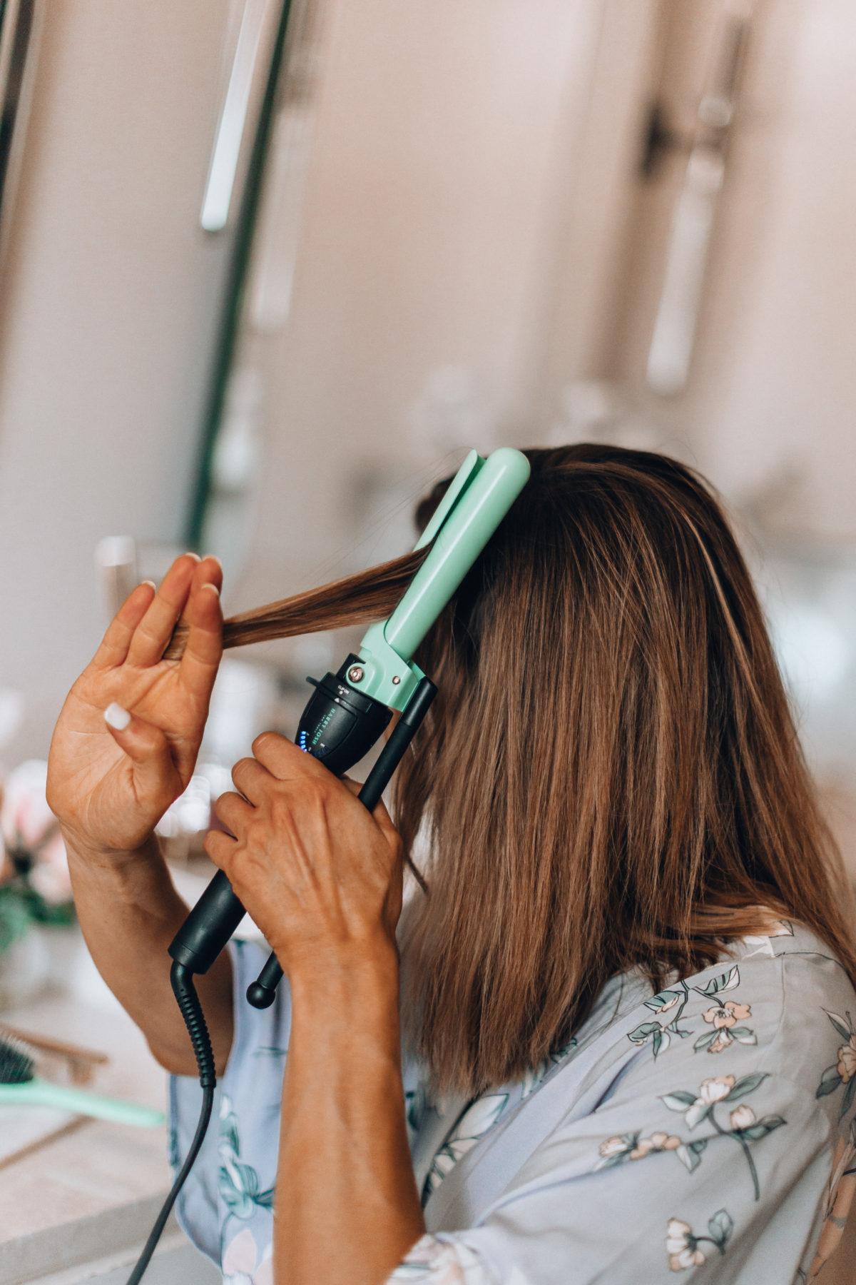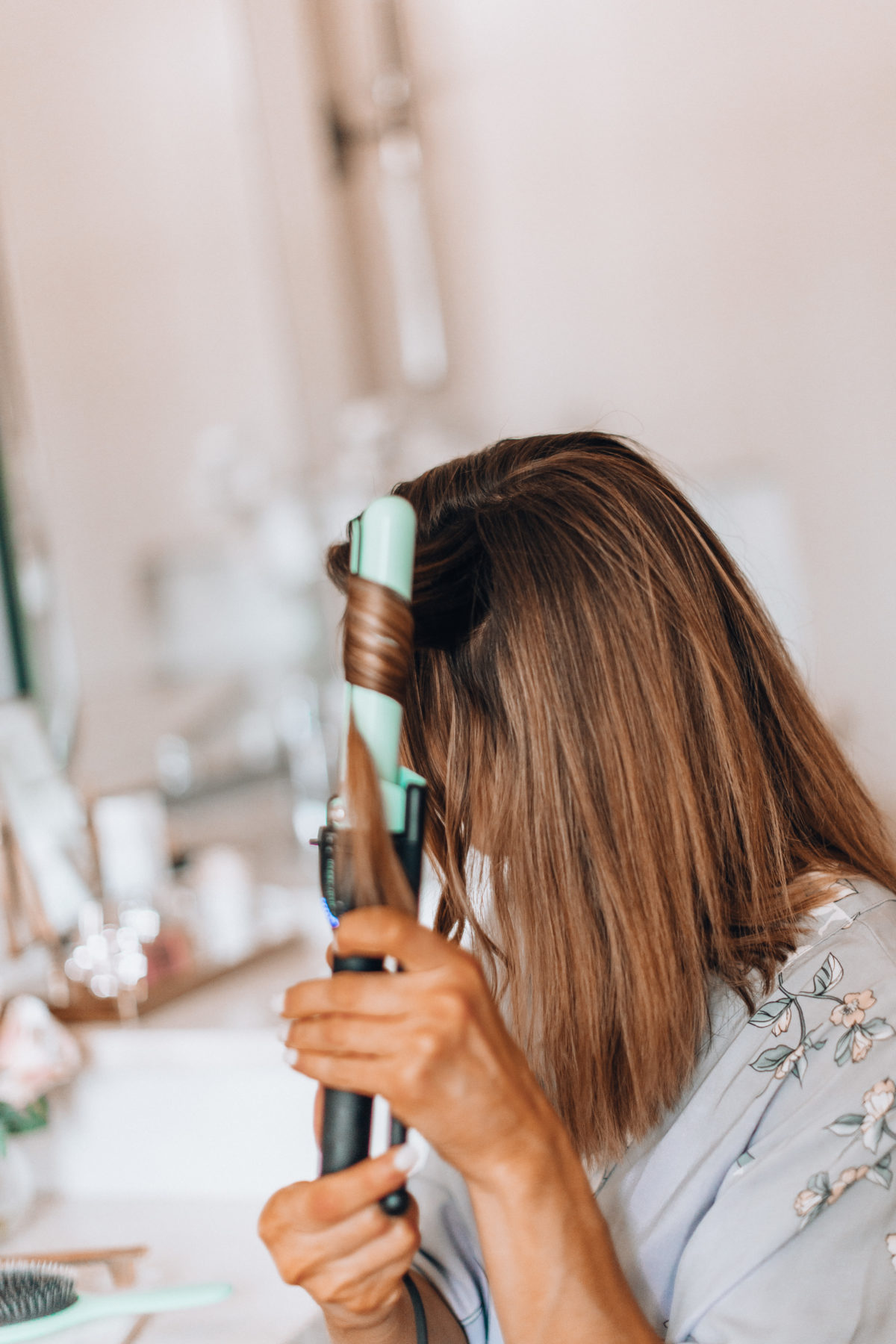 If your hair is wet, you’ll want to first blow dry it with the Harry Josh blow dryer. I swear it dries my hair in just a few minutes, and when you have two kids time is everything, right? I then brush my hair out with this wooden paddle brush to wrangle any flyaways. Next, and this part is crucial, give your hair a spritz of texture spray or just dry shampoo works too. This will give your hair more grip, which will help the curls last longer.