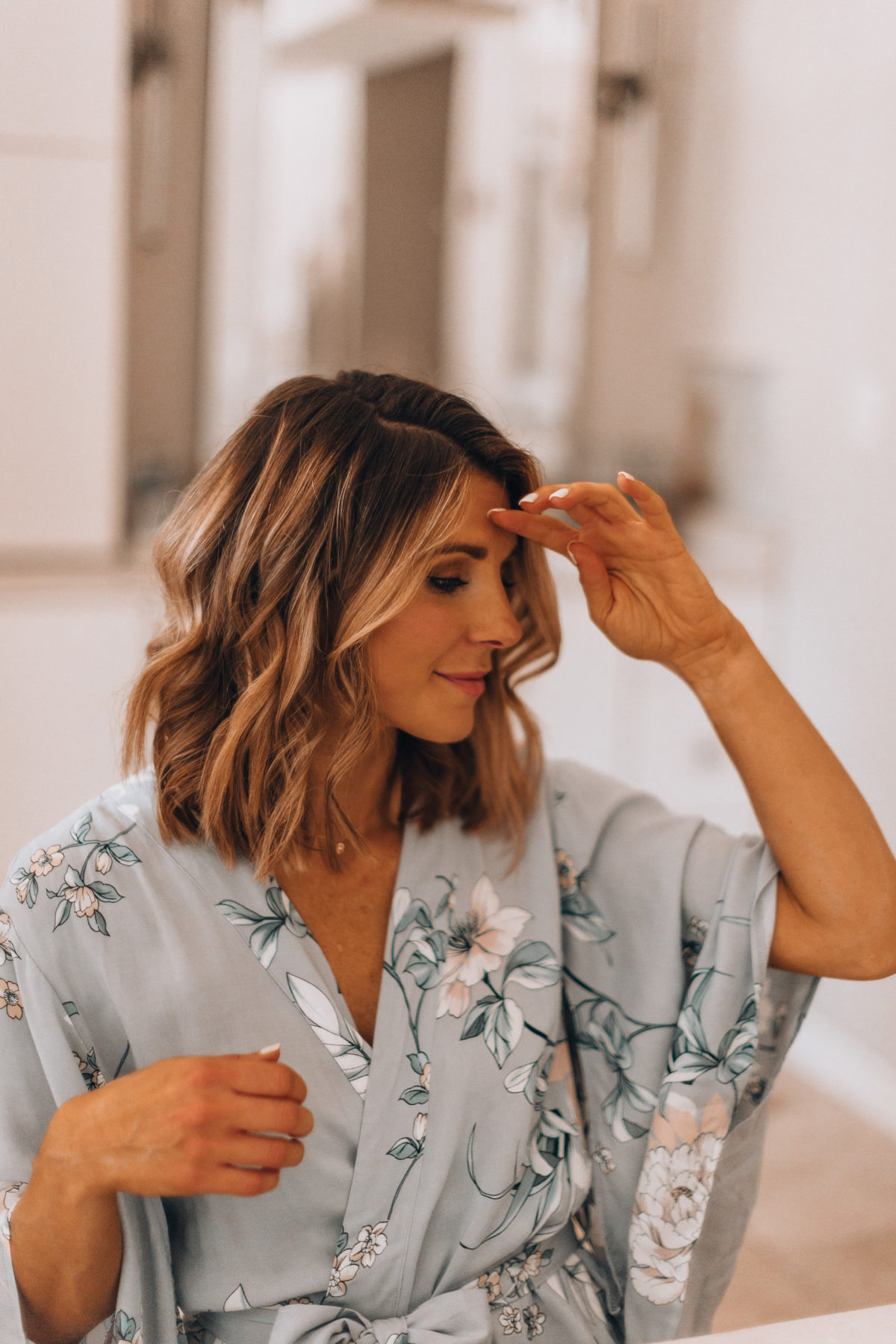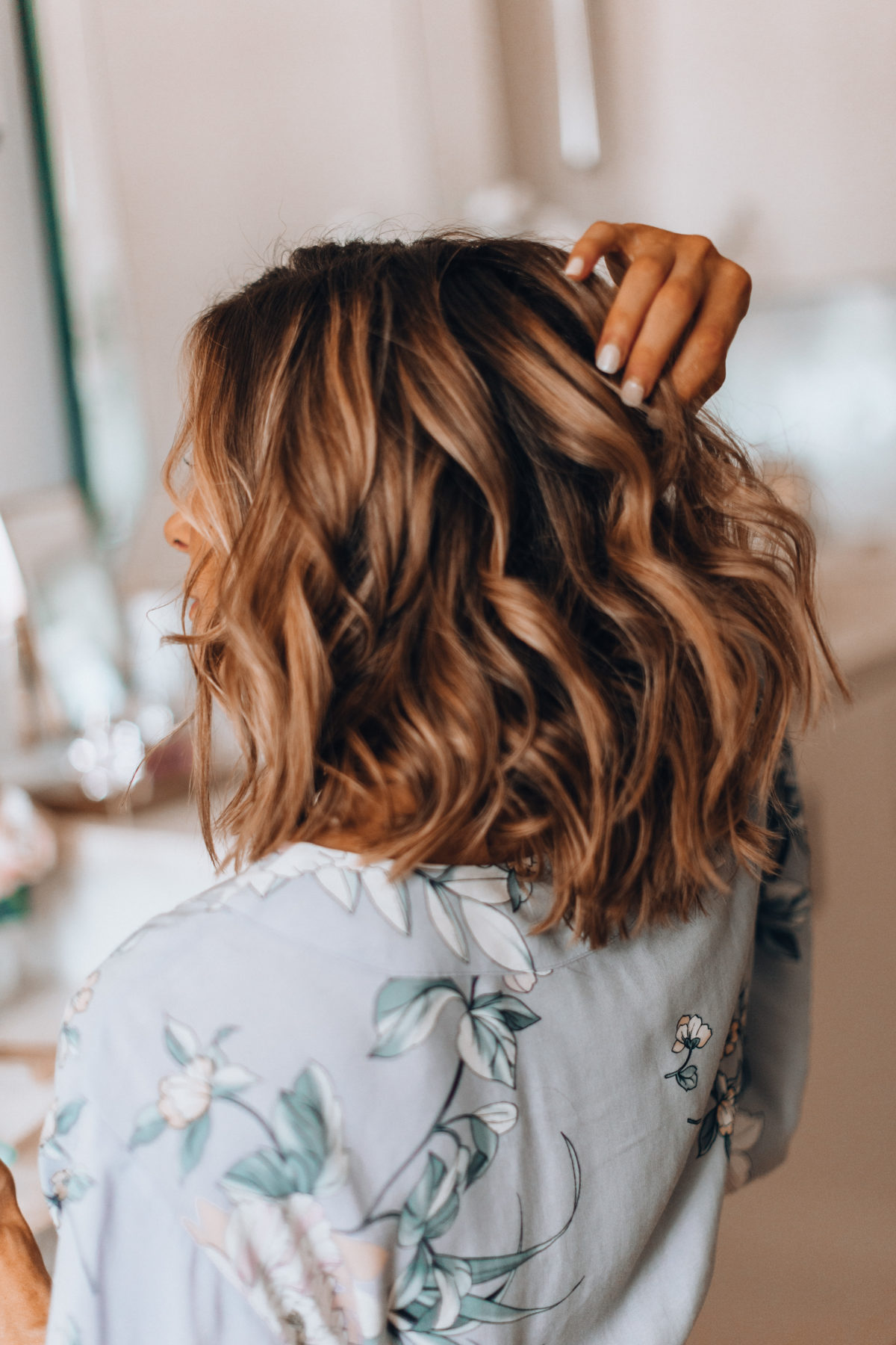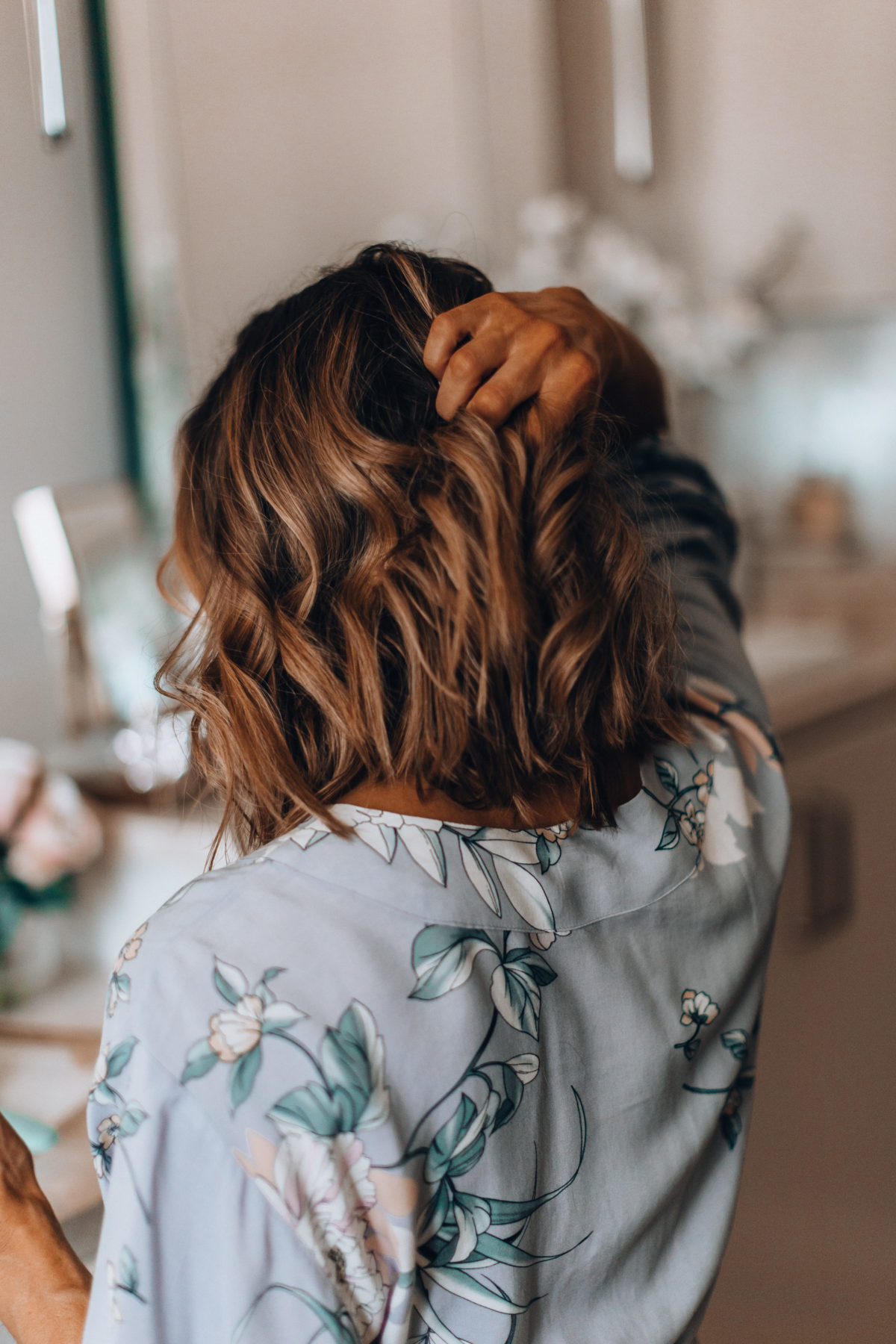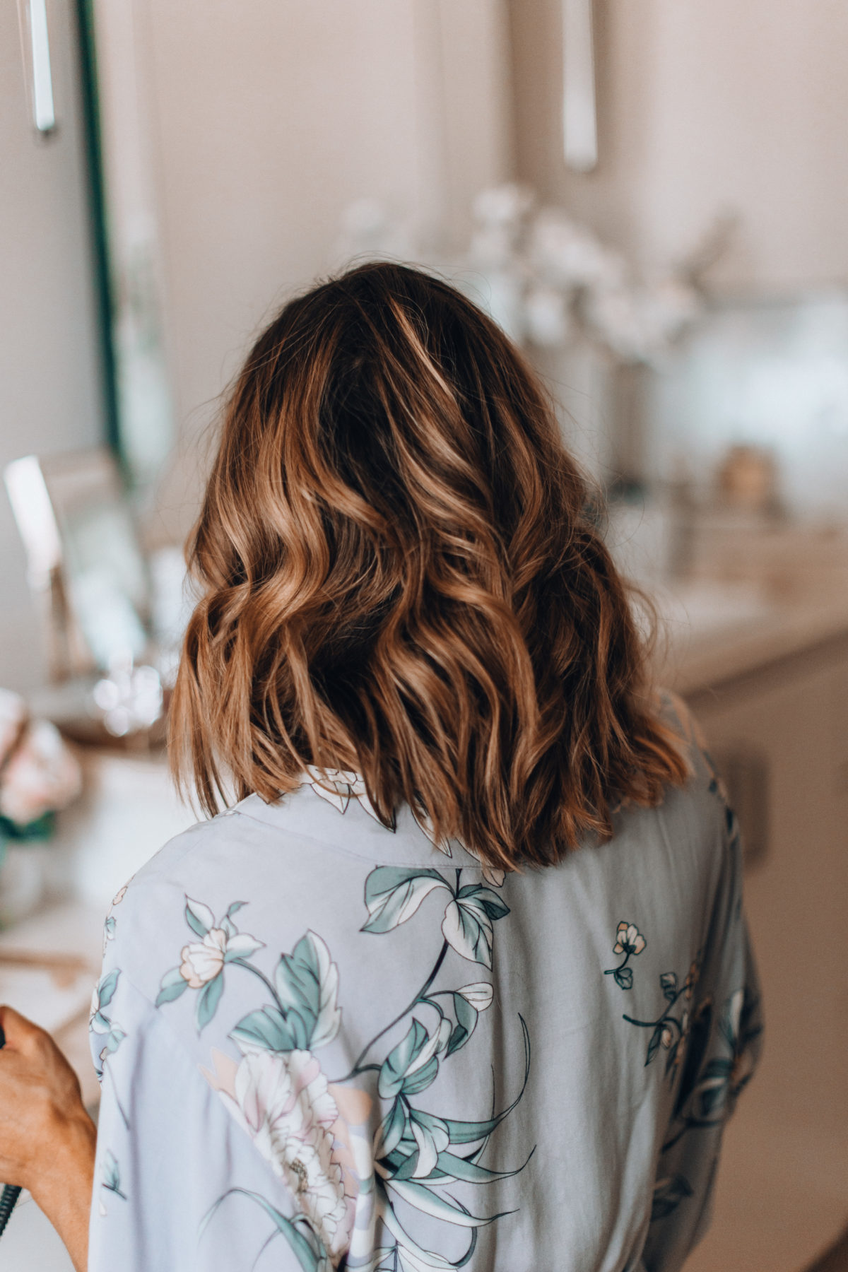 If your hair is wet, you’ll want to first blow dry it with the Harry Josh blow dryer. I swear it dries my hair in just a few minutes, and when you have two kids time is everything, right? I then brush my hair out with this wooden paddle brush to wrangle any flyaways. Next, and this part is crucial, give your hair a spritz of texture spray or just dry shampoo works too. This will give your hair more grip, which will help the curls last longer.
