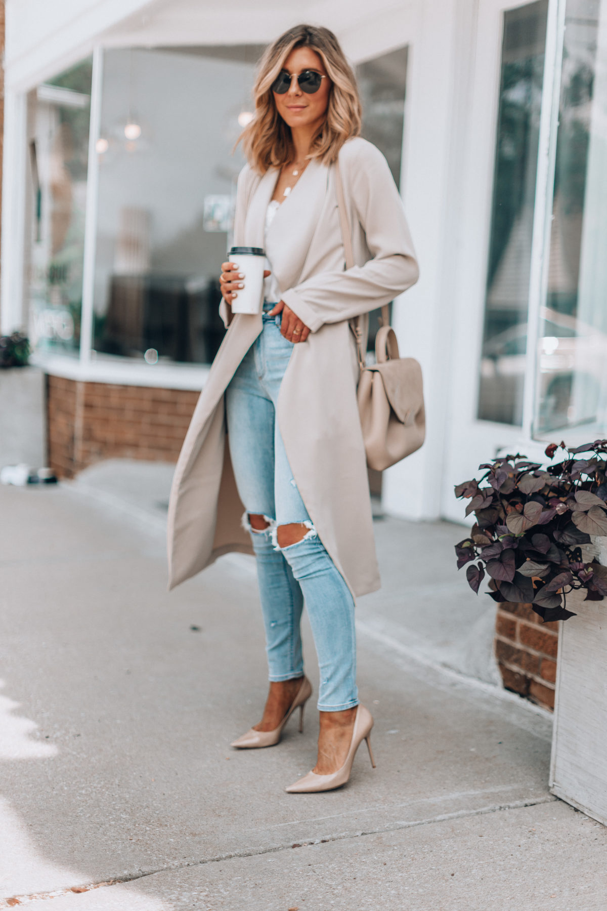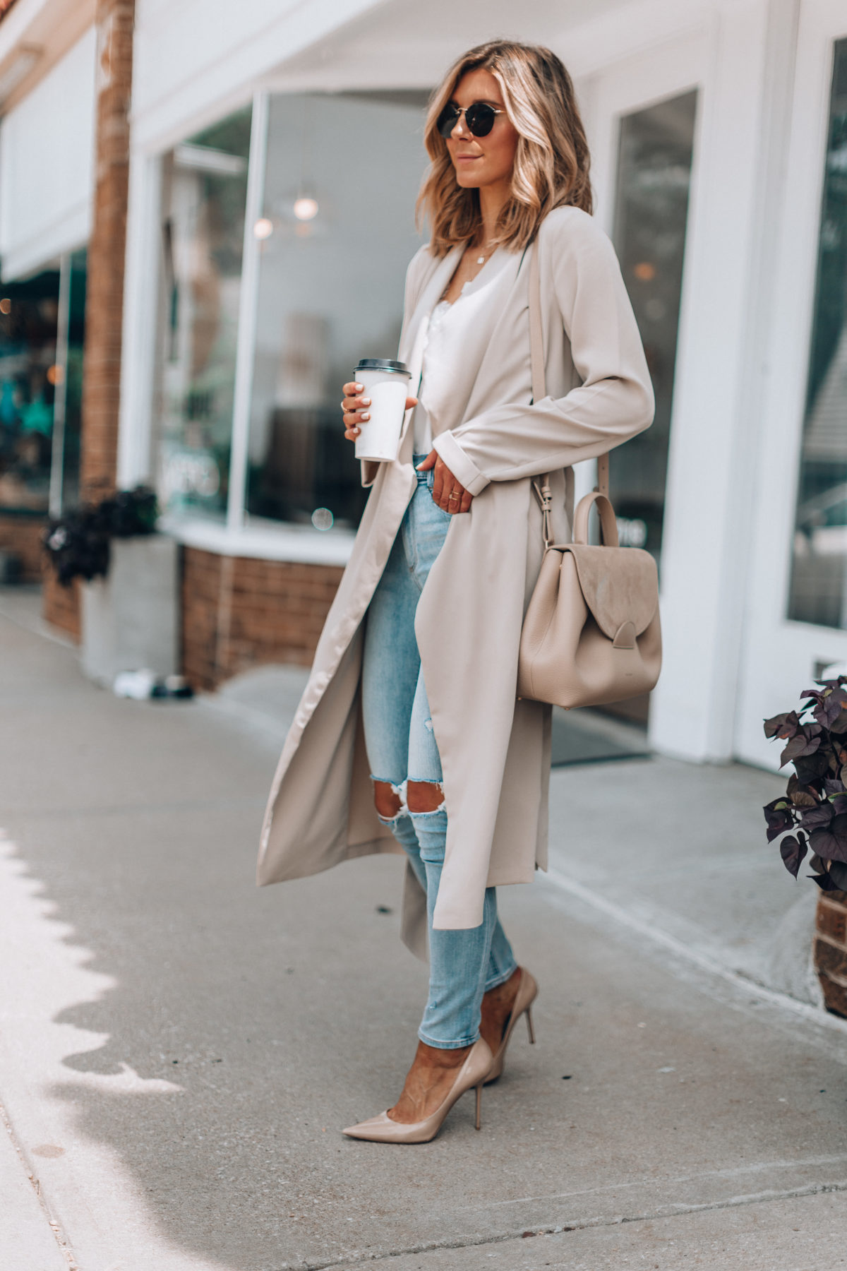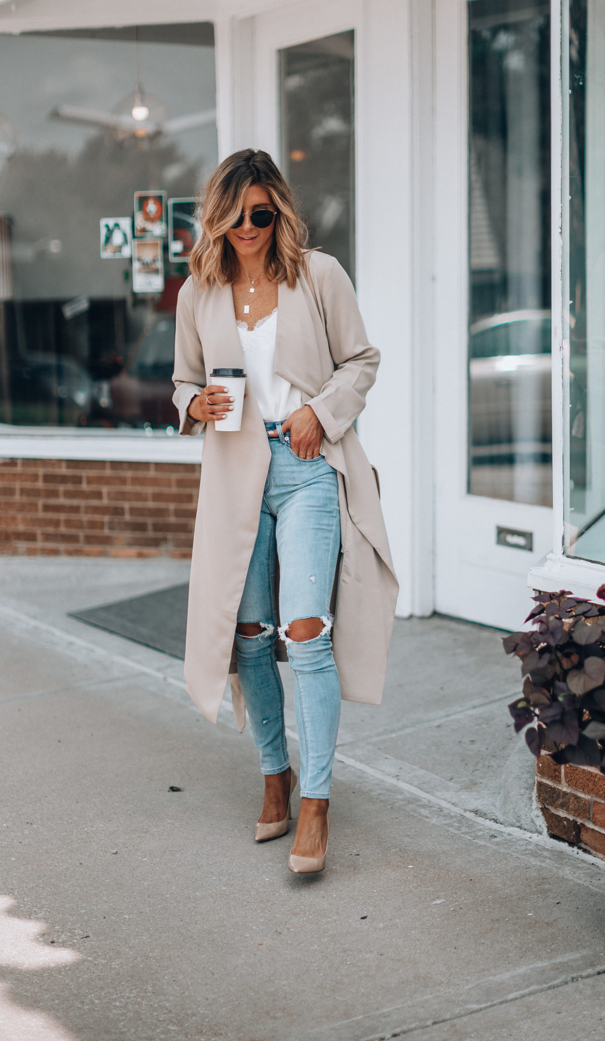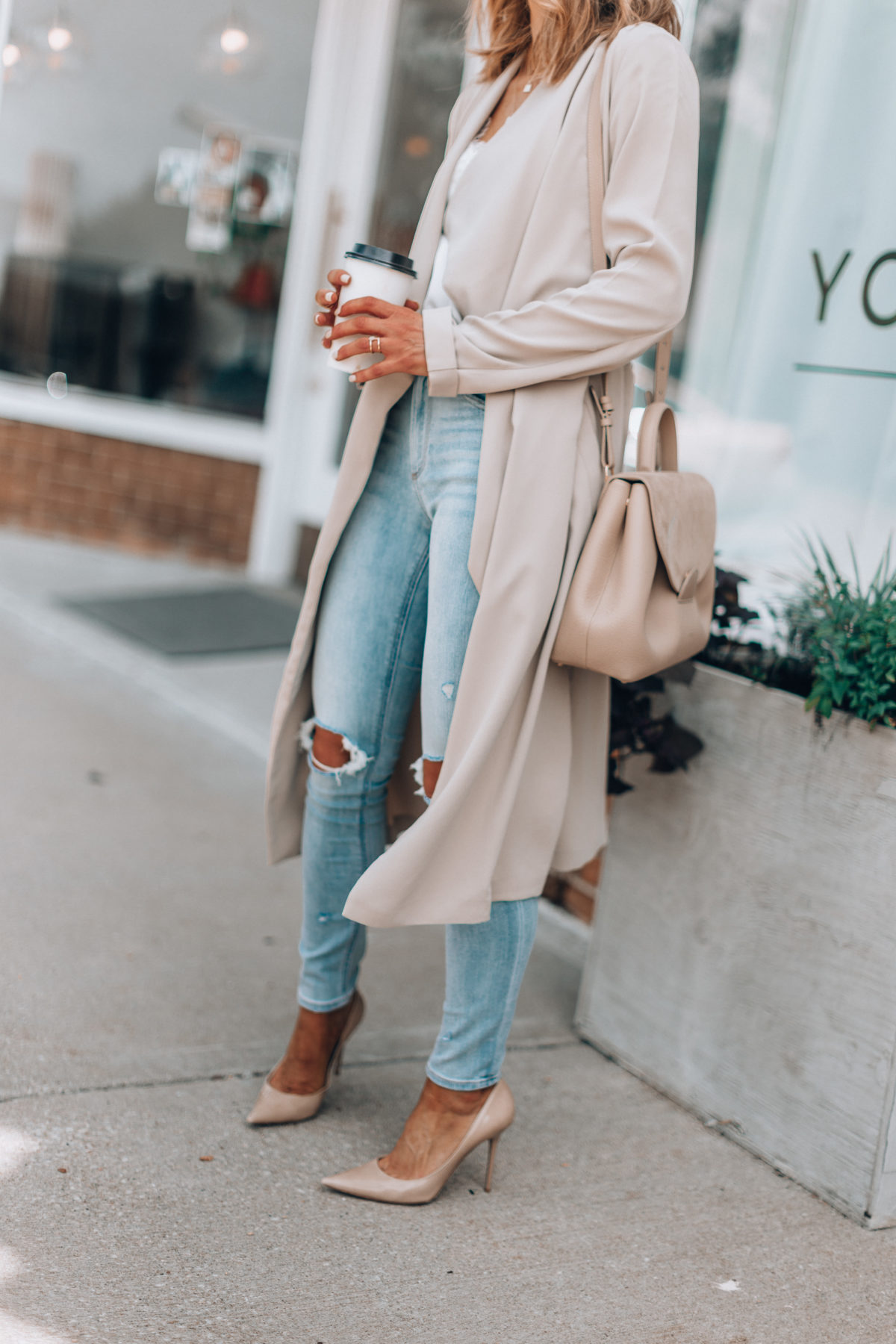 One of my favorite tips for transitioning from summer to fall is light shades in general – just in fall pieces. So a khaki trench or an ivory cami like I’m wearing here, and of course, light denim jeans. This way, you’re beginning to introduce pieces that match the weather but your outfit still feels right for early fall. I also like wearing taupe, blush and gray to accomplish this tip.Â