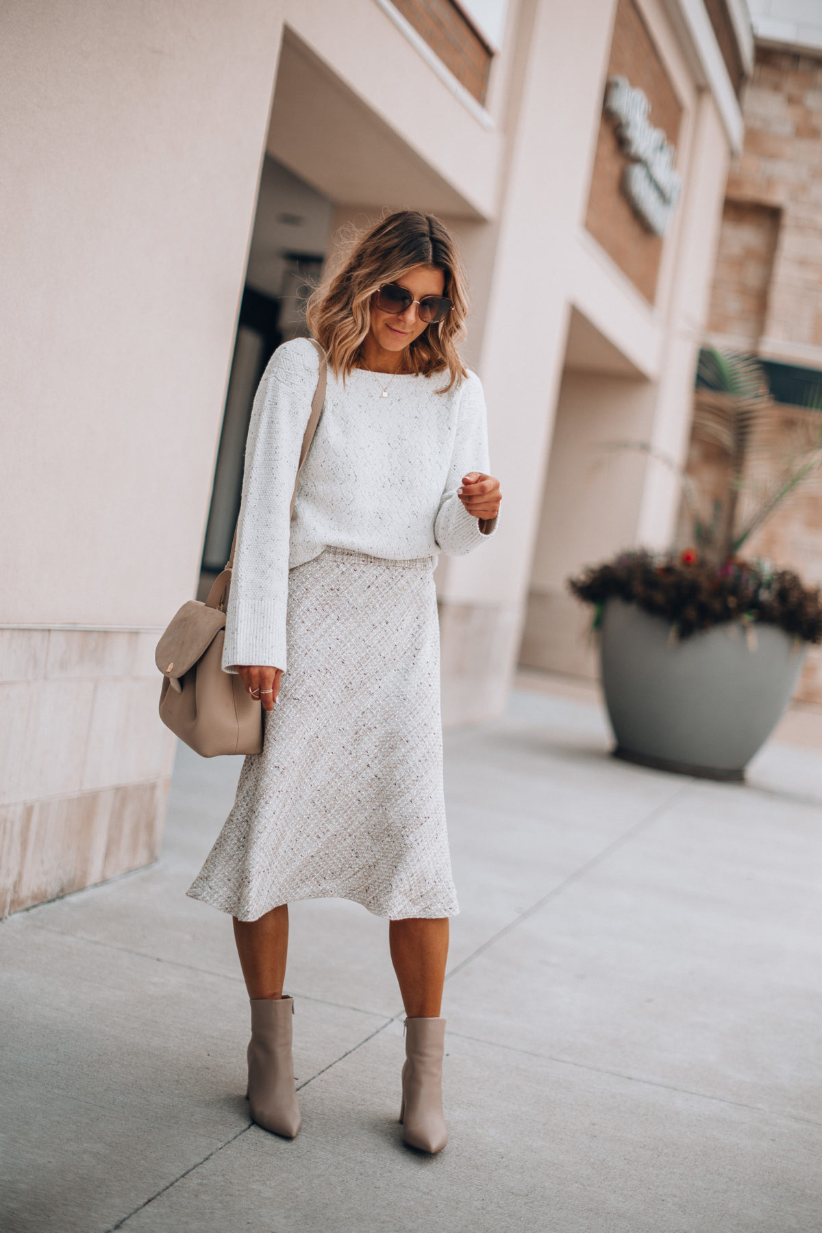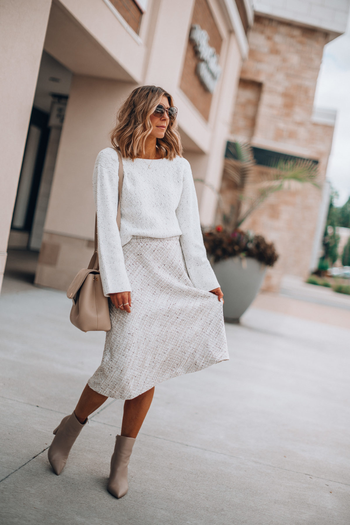 Next up we have this gorgeous tweed skirt. There’s something about tweed that always makes me feel a little more elegant and sophisticated. Anyone else? Because I love it so much I wanted to let it be the star of the show so I went with a casual sweater (another one of those pieces that’s very versatile!) and block heel booties. Tweed is a great way to take your workwear up a notch but keep it easy and simple when getting dressed in the morning.