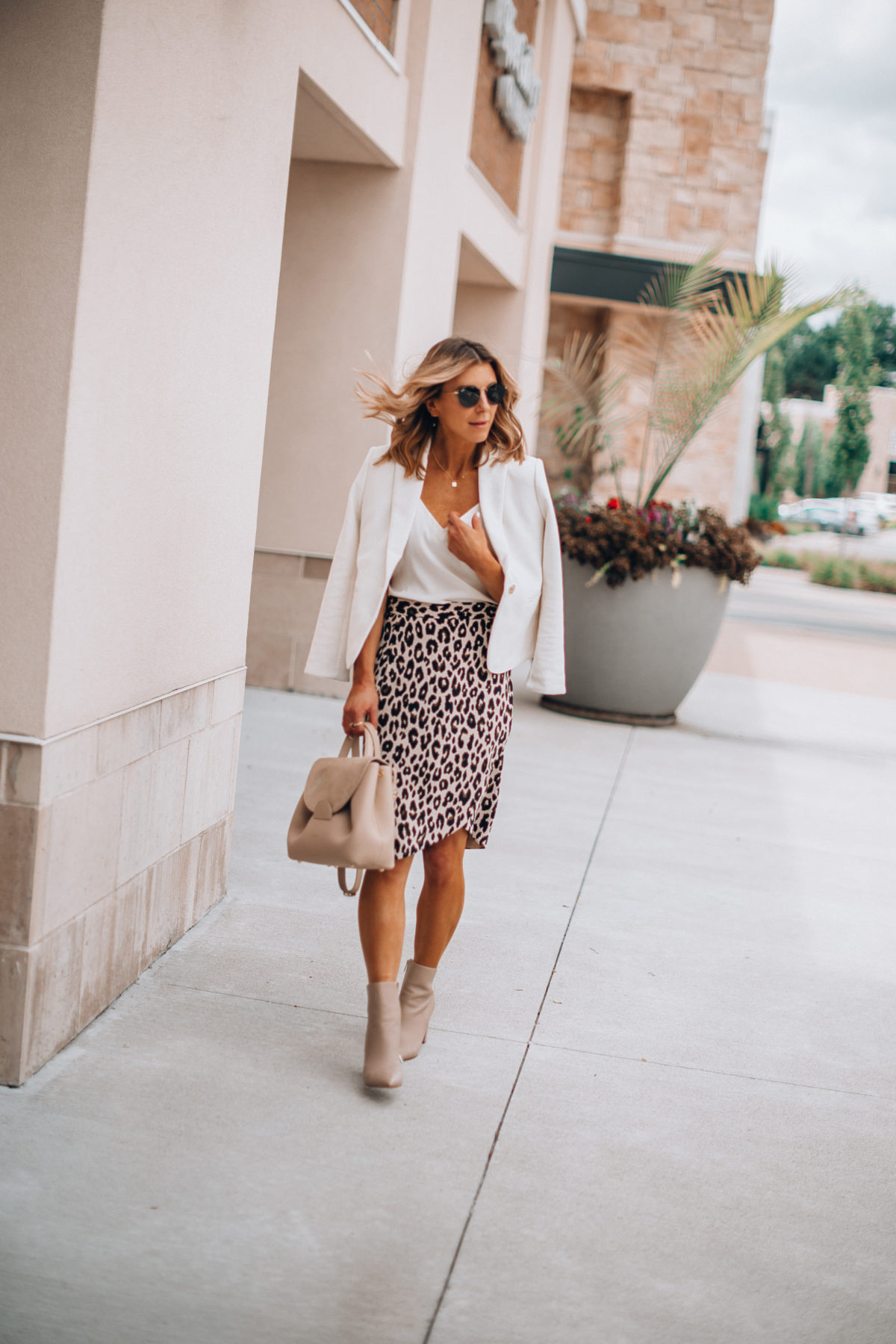 This is outfit might be my favorite because of the amazing leopard print wrap skirt. This is one of those pieces that you can dress up for the office with a blazer and heels or booties, but then also wear with a white tee and sneakers on the weekend. Such versatility! Plus, I don’t think leopard print is going anywhere anytime soon, so definitely snag this skirt!
