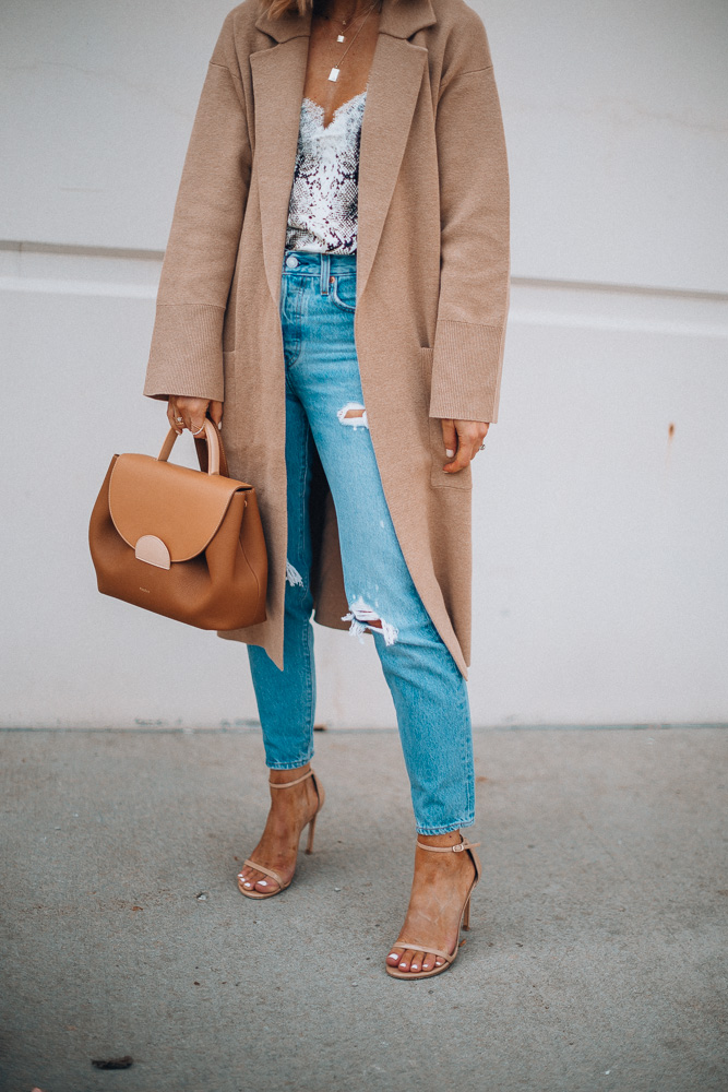 Look 2: Sweater Coat & another option here // Ripped Jeans TTS // Nude Heels // Silk Cami // Bag