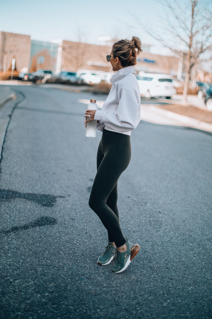 In order to get to a place where working out doesn’t feel like a chore, you have to start building it into your routine. Even if that means starting small with walks and playing with the kids. Something that always motivates me is getting new activewear from lululemon. Something about their workout clothes just gets me excited – like their buttery-soft Align pants. Wow. If you haven’t tried these yet, you absolutely have to! Plus they’re super flattering and very comfortable, which I love. And this cropped short sleeve top – my favorite style right now – goes perfectly with high rise bottoms. Throw this pullover on after you’re done sweating and you’re good to go!