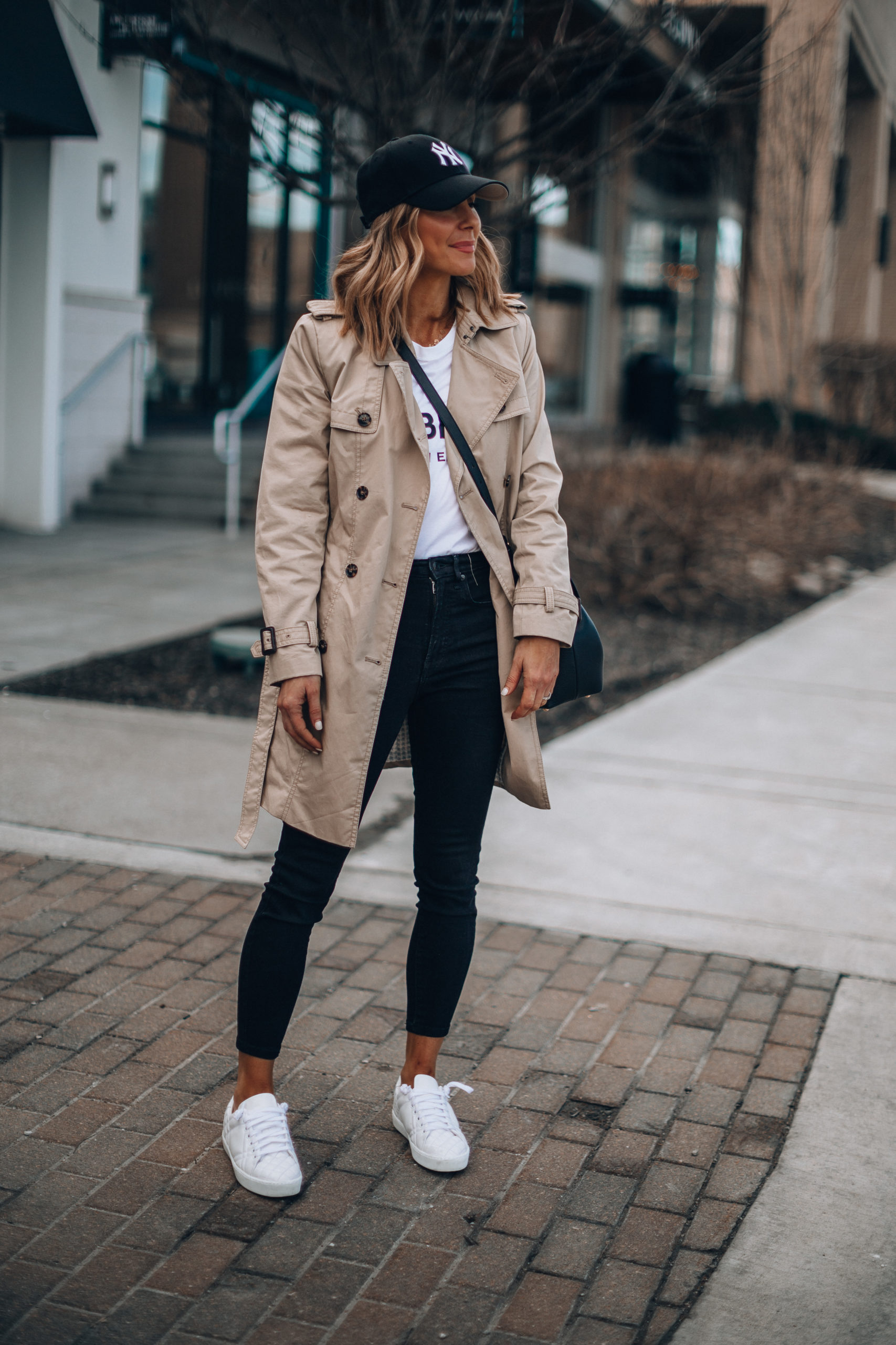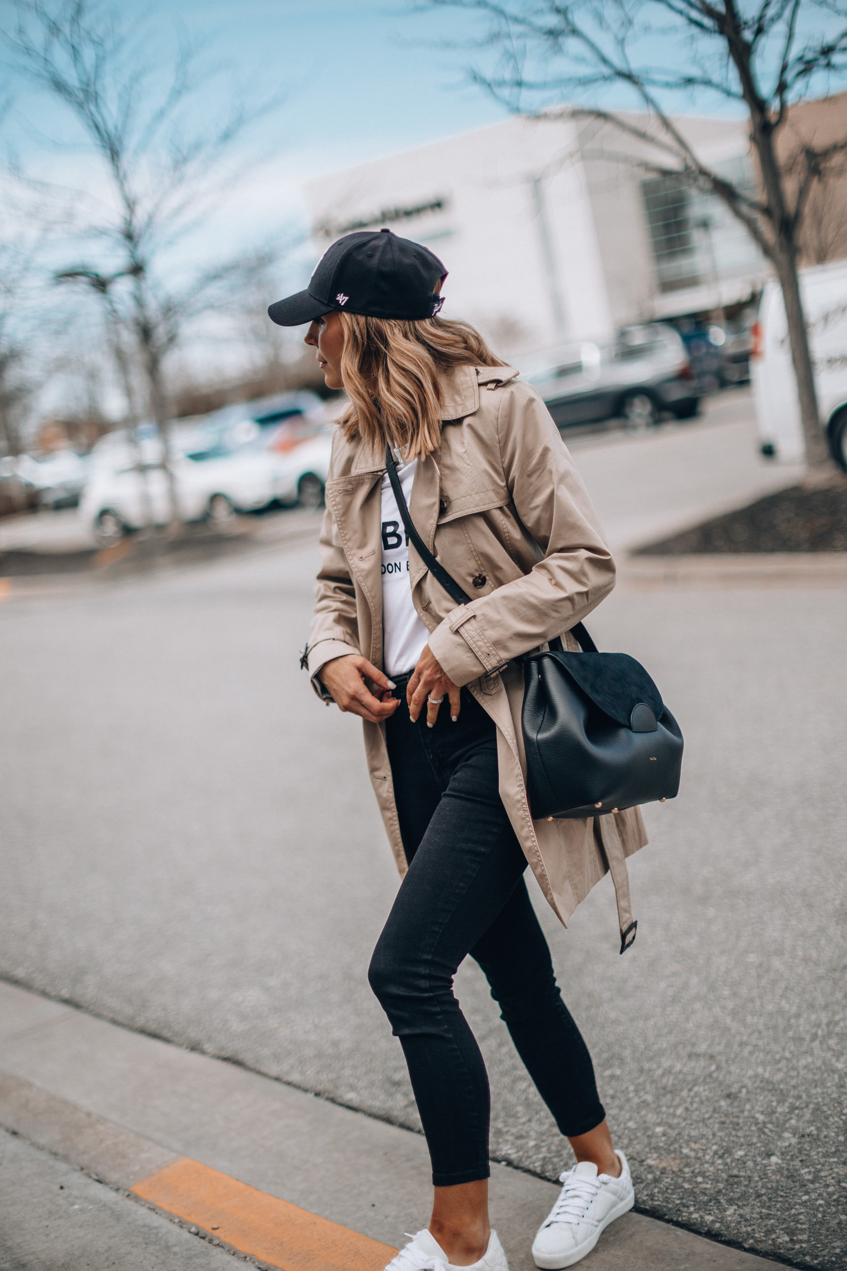 A high waisted skinny jean is one of my favorite weekend pants to wear because they are comfortable to wear around the house, but if you are headed out you can easily dress them up. During the day a long trench coat & simple white tee paired with a ball cap & tote bag is one of my go-to spring outfits. So easy, so comfortable!