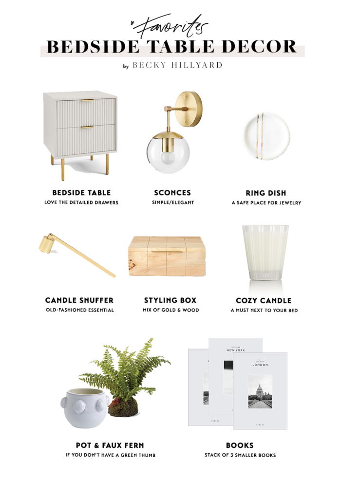 I love two matching side table and along-side the dresser I think side table decor is super important. I recommend having a lamp or sconce, a cozy candle, stack of books, something green or fresh flowers in a beautiful vase, and a tray to hold all your trinkets.
