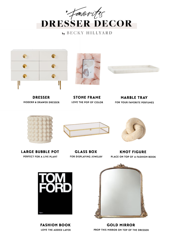 I love looking at dresser decor on Pinterest! Depending on what kind of functionality you need in your room I love putting a beautiful piece of art above the dress or an oversized mirror. I think a dresser is a great place to display your perfume bottles & ย jewelry. I would put an array of bottles on this marble trayย and lay jewelry in the glass boxย – it’s both functional and beautiful.