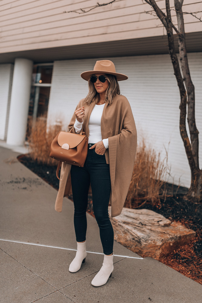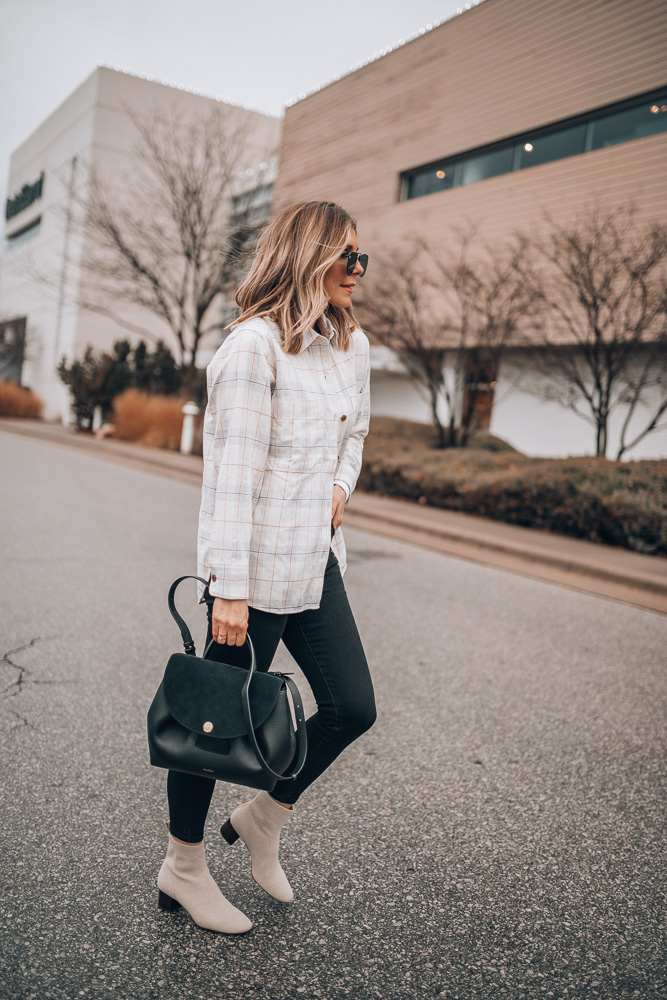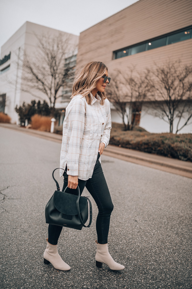 many amazing timeless pieces! To showcase a few of my favorites, I styled two outfits for you guys. They both include these amazing black skinny jeans. They’re one of my go-to pairs as they’re soft and have just the right amount of give but don’t lose their shape. They’re also the perfect length to wear with booties, which is ideal for fall and winter! Speaking of booties, this pair that I’m also wearing with both looks from Everlane is so unique yet classic! And you feel like you’re only wearing socks!