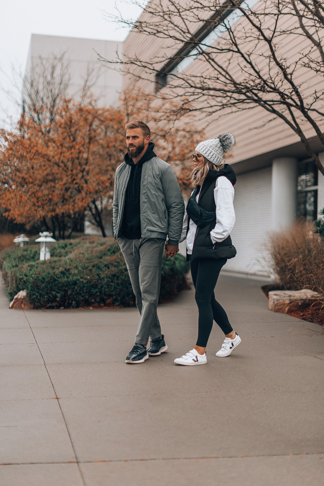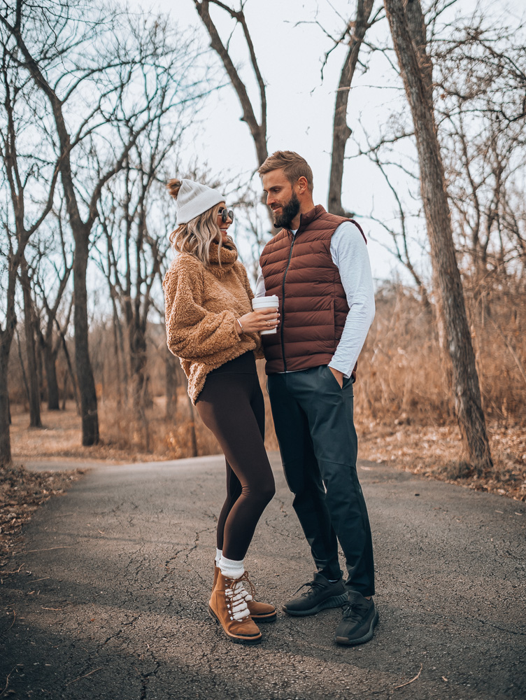 Men’s Henley | At Ease Joggers | Puffer VestWomen’s Sherpa Pullover | Sherpa Weave Pom Beanie | Align Leggings