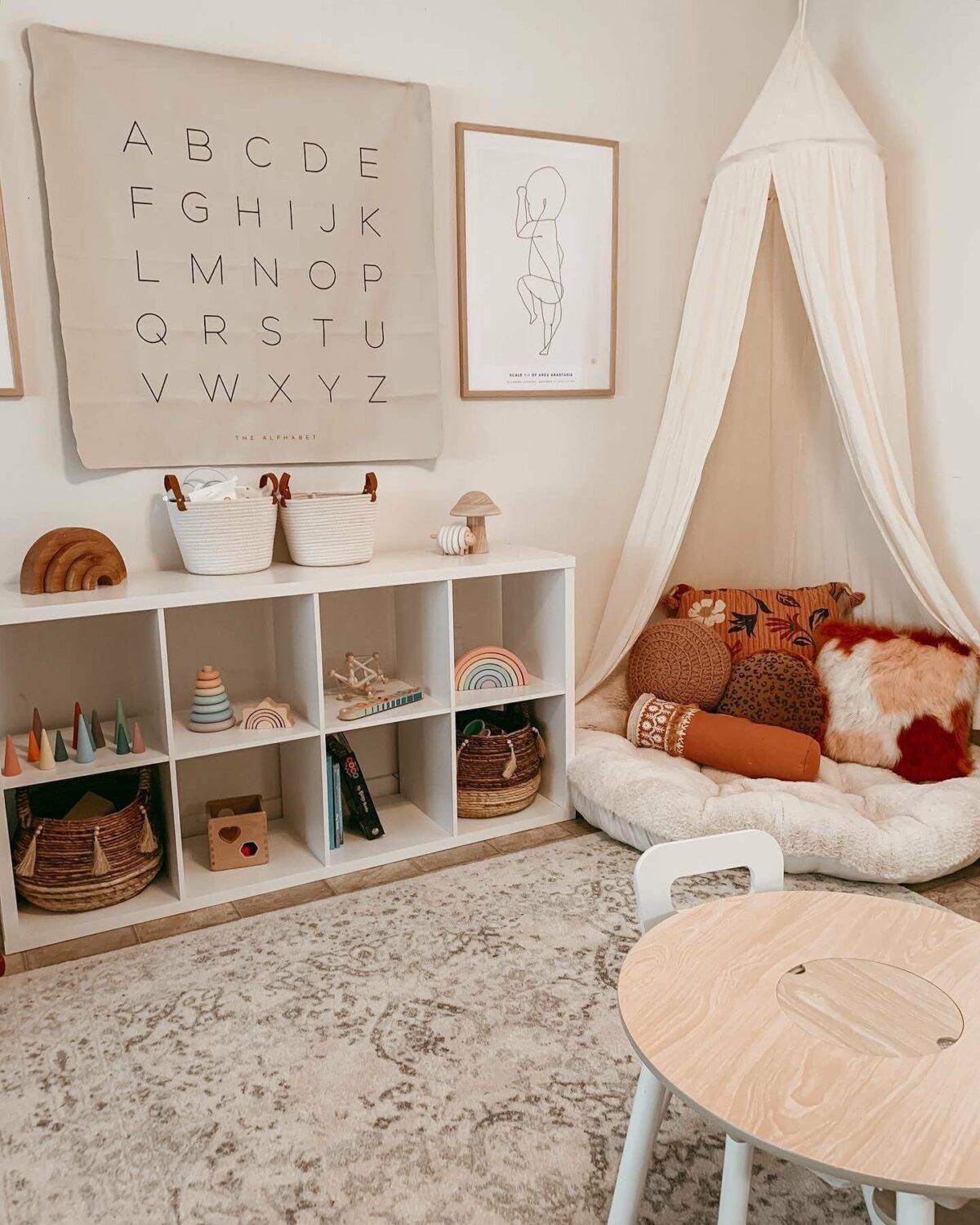 Bean Bag // Hexagon Shelves // Wood Cabinet // Floor Lamp // Storage Bins // Easel Stand // Baskets // Book Shelf // Pendant Light // Wallpaper //