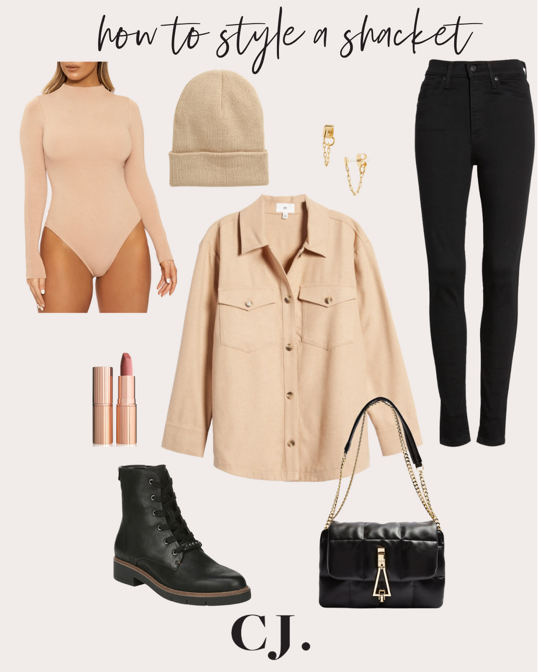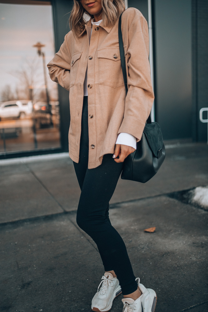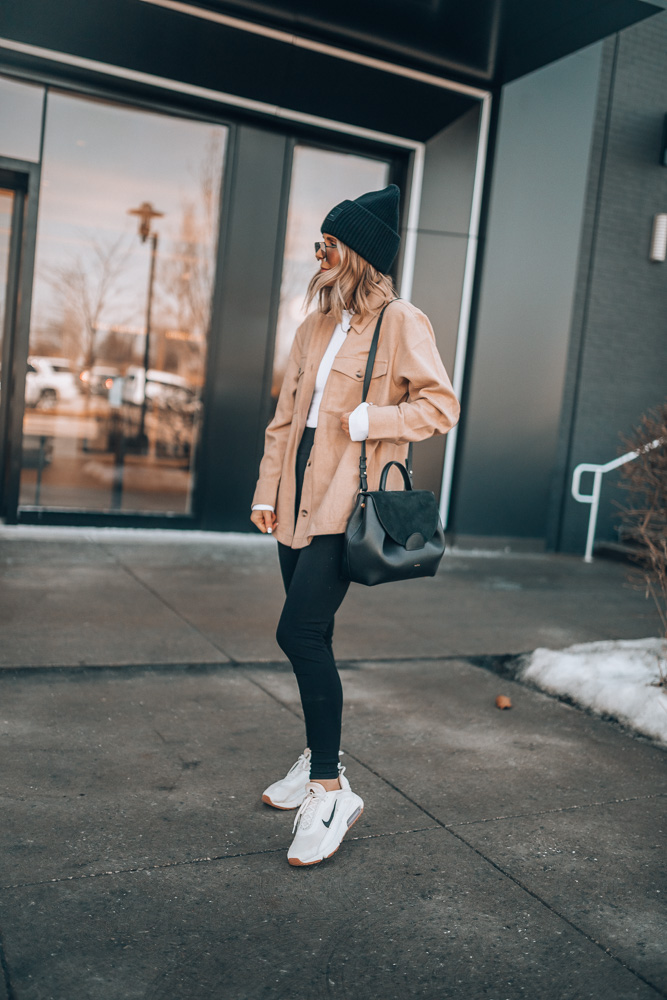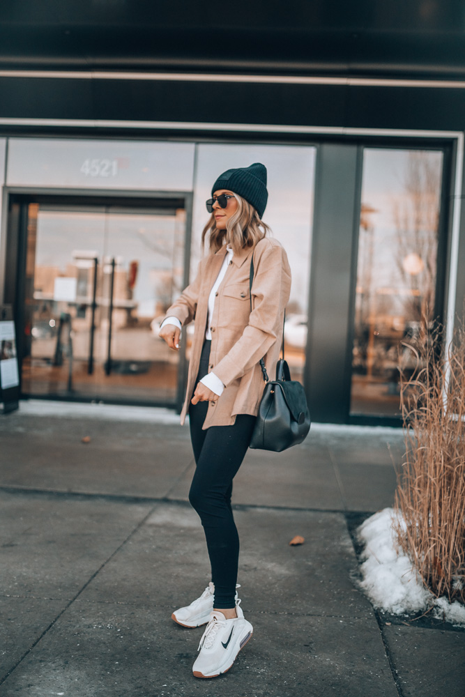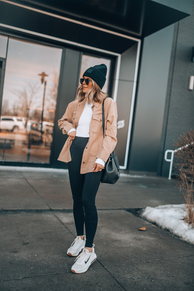 For this afternoon coffee run, I layered the shacket over a super basic everyday outfit including a ribbed white mock neck (comes in a bunch of colors!), black leggings and sneakers. Beanie and sunglasses and I’m out the door. I’m also including two other ways you can style the shacket, which I guarantee will become your favorite layering piece for spring!