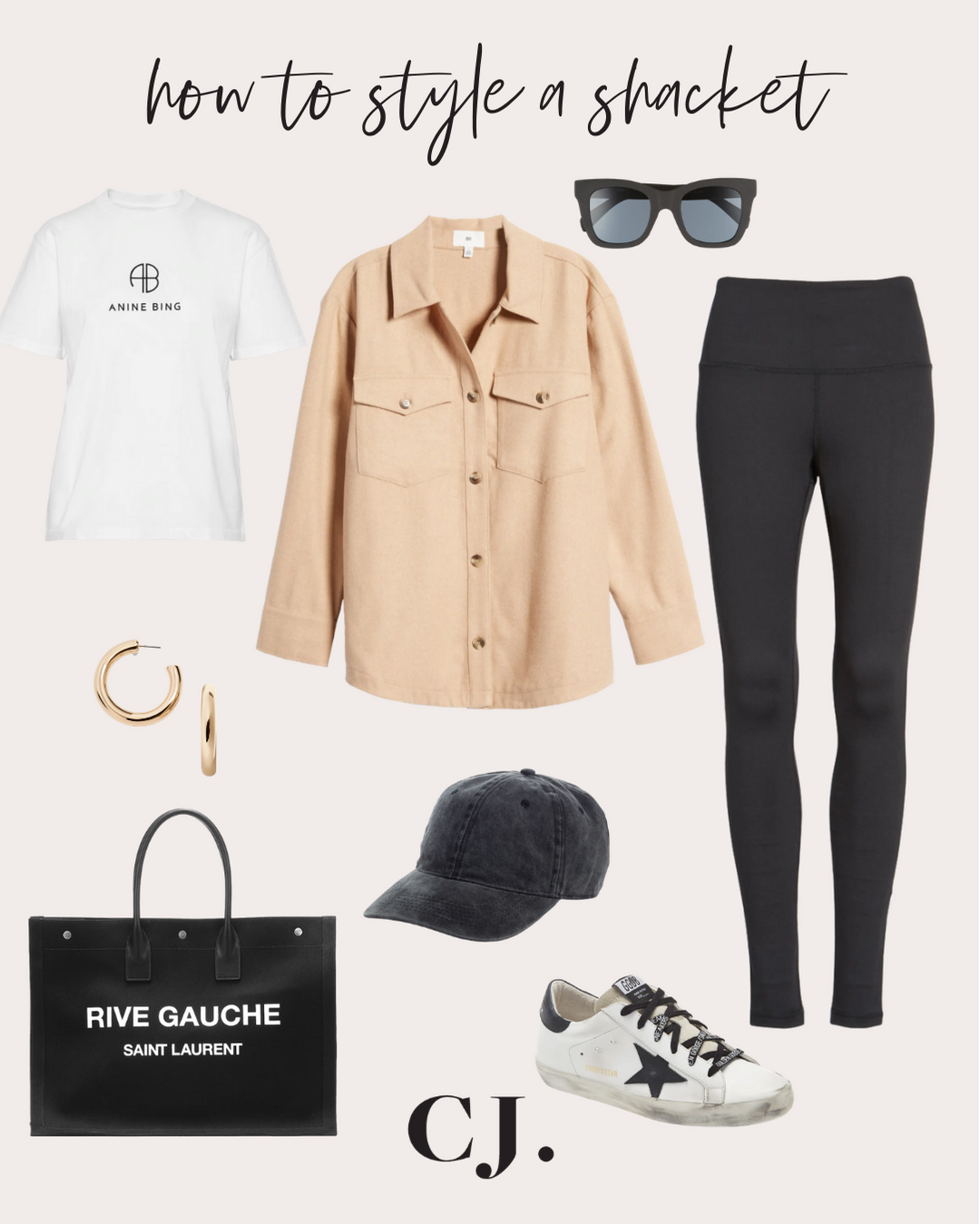Shacket (size Medium) // Tee // Leggings // Cap // Sneakers // Sunglasses // Gold Hoop Earrings // Tote