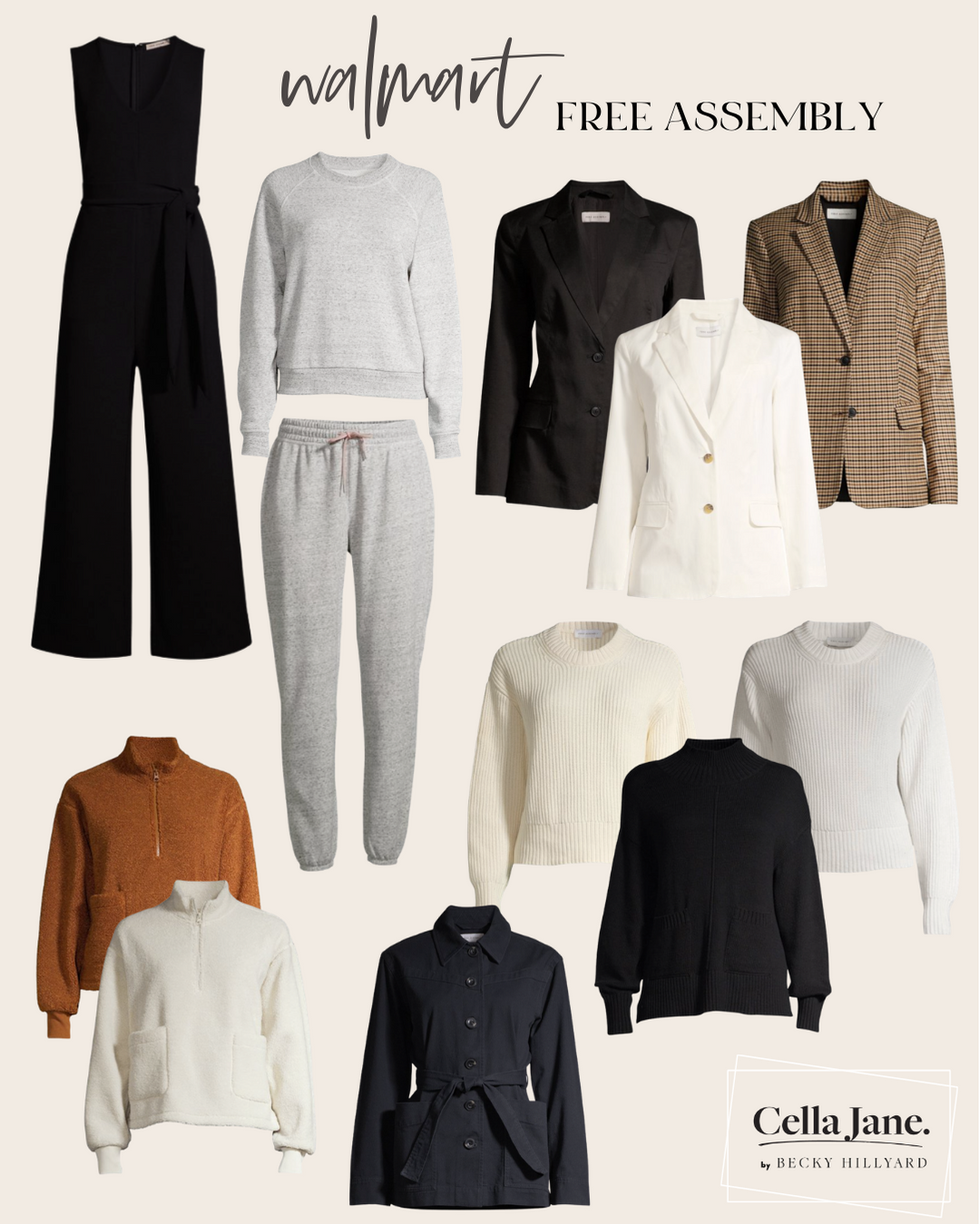 Jumpsuit // Gray crew neck // Gray joggers // Black blazer // White blazer // Plaid blazer // Tan sherpa // White sherpa // Black button-up tie belt // Cream knit sweater // Black sweater // White sweater