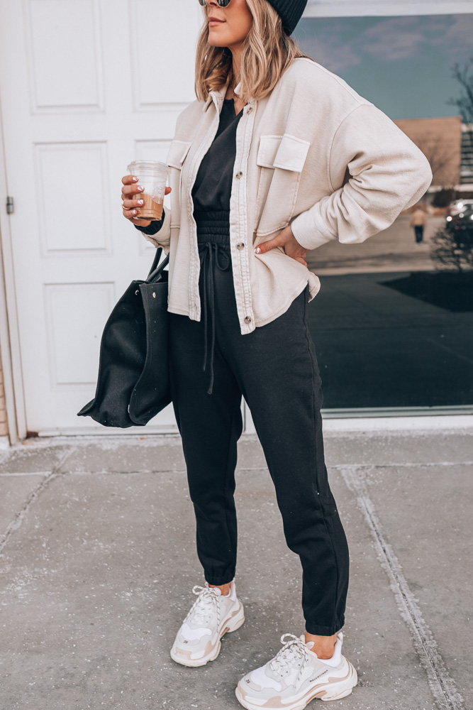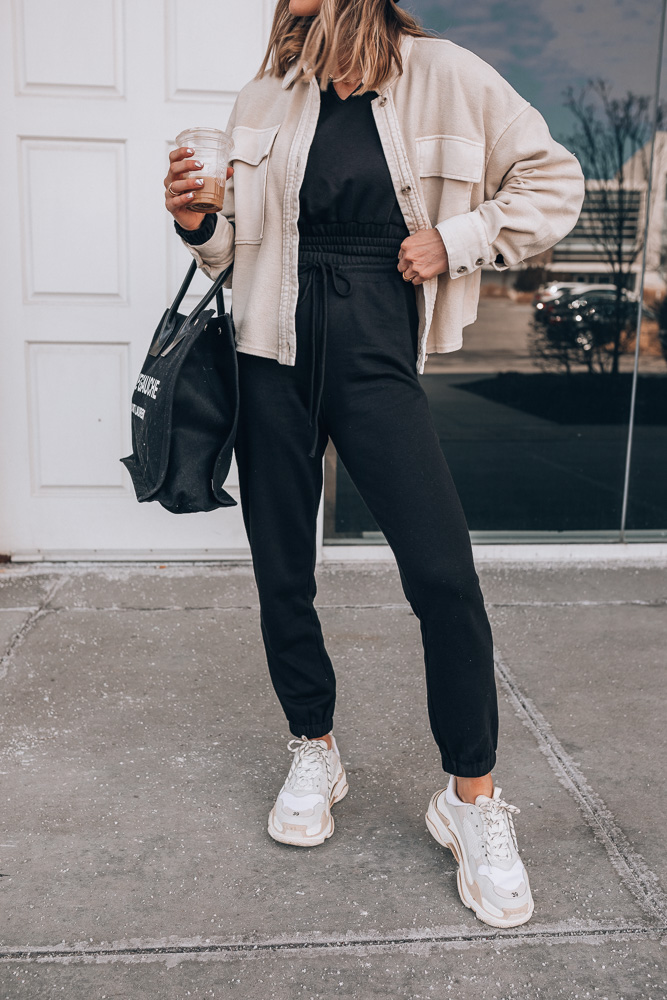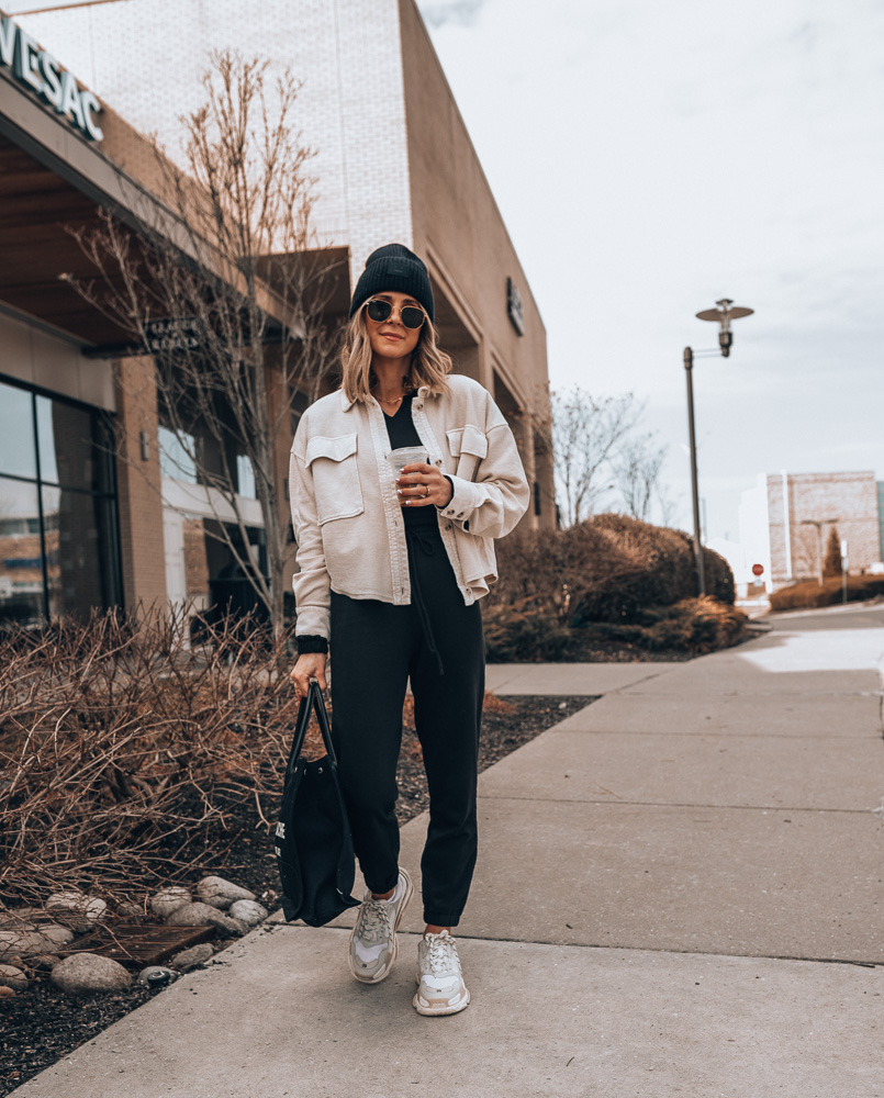I love these joggers and sweatshirt that come together as a set for just $40, so you really can’t go wrong. Plus, I highly recommend having black joggers in your closet – you’ll wear them non-stop and they go with everything! And although this is a pretty classic look, I’m absolutely loving the cropped sweatshirt, which is a bit trendy. It adds a little something unexpected and is so flattering with any high-waisted bottom. Both pieces are also actually made of a French terry material instead of a fleece, which is a nice way to mix up your loungewear. And I absolutely could not resist this jacket! It comes in lots of great colors for spring too!
