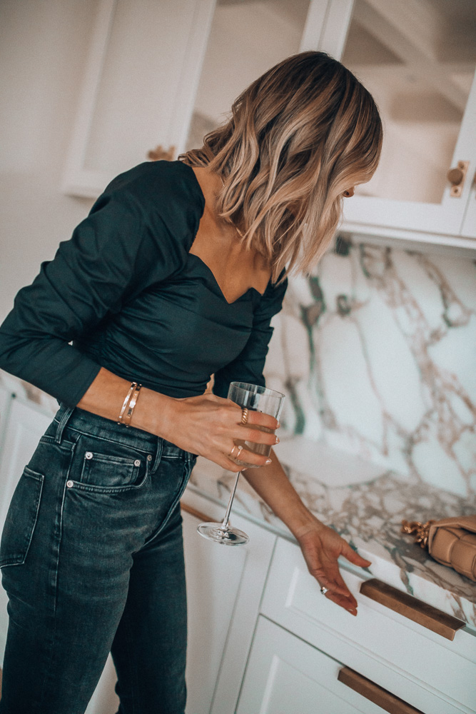 I’m a huge neutrals lover, so this outfit is my go-to for date night. I’ve been obsessed with these jeans lately as they are the perfect color black and love the high waist. (I actually own this denim style in other washes and love every pair!) This sweetheart neckline top is perfect, especially with the delicate ruching making it a tad more dressy. I’m totally into woven leather this season, so I paired with my favorite heeled sandals and this beautiful chain bag.