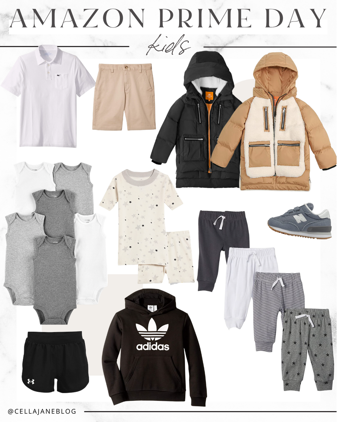 Polo // Khakis shorts // Black coat // Tan coat // Onesies // Pajamas set // Pants set // Sneakers // Athletic shorts // Sweatshirt