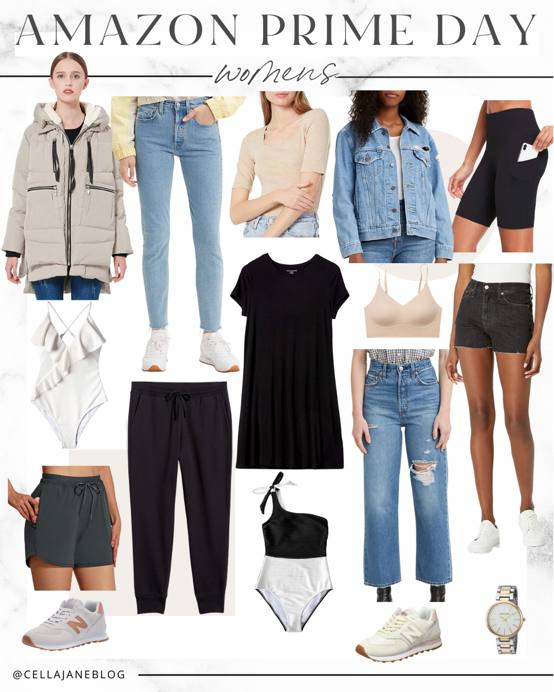 Coat // Skinny jeans // Tan top // Denim jacket // Bike shorts // White swim suit // Joggers // Dress // Bra // Jean shorts // Athletic shorts // New balance sneakers // White & black swim suit // Straight leg jeans // Watch