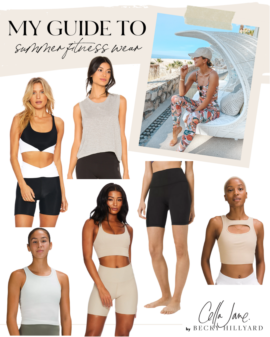 Black & White bra // Black & white bike shorts // Gray tank top // Gray fitted bra tank top // Tan sports bra // Tan bike shorts // Black bike shorts // Tan fitted bra tank top