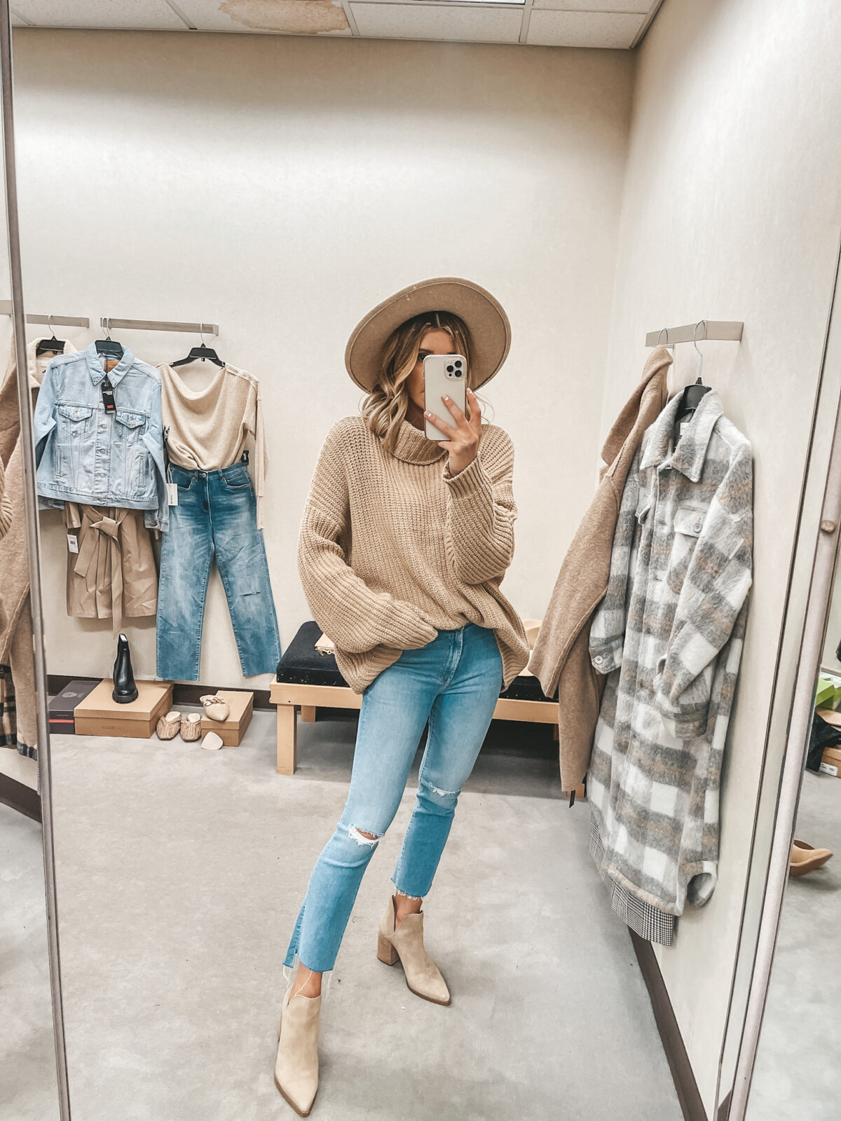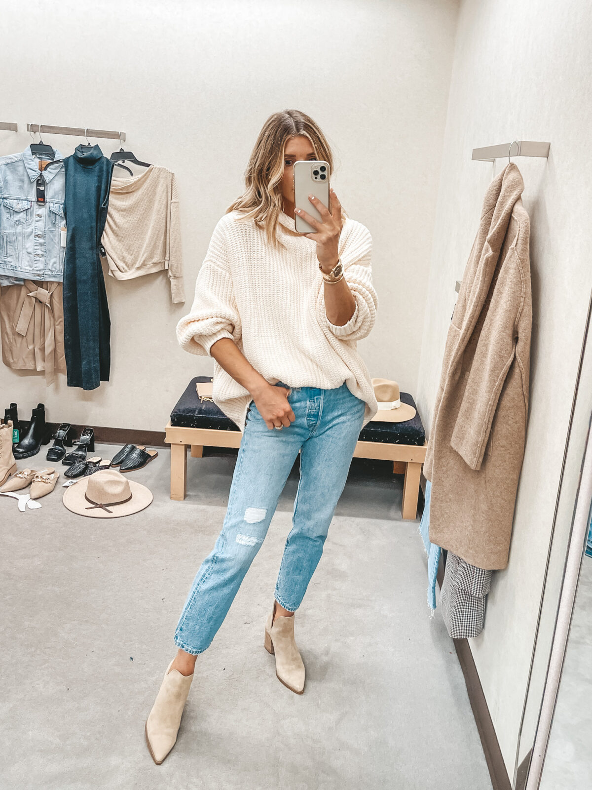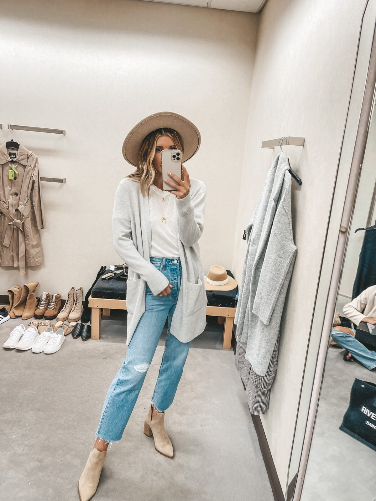 Other items pictured: Cardigan, Jeans, Boots, Booties, Hat, Bag, Earrings, Huggies, Marquise Necklace, Coin Necklace, Crescent Necklace