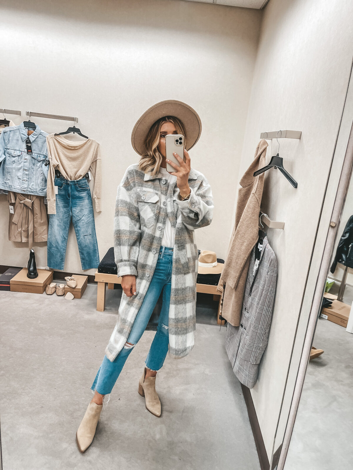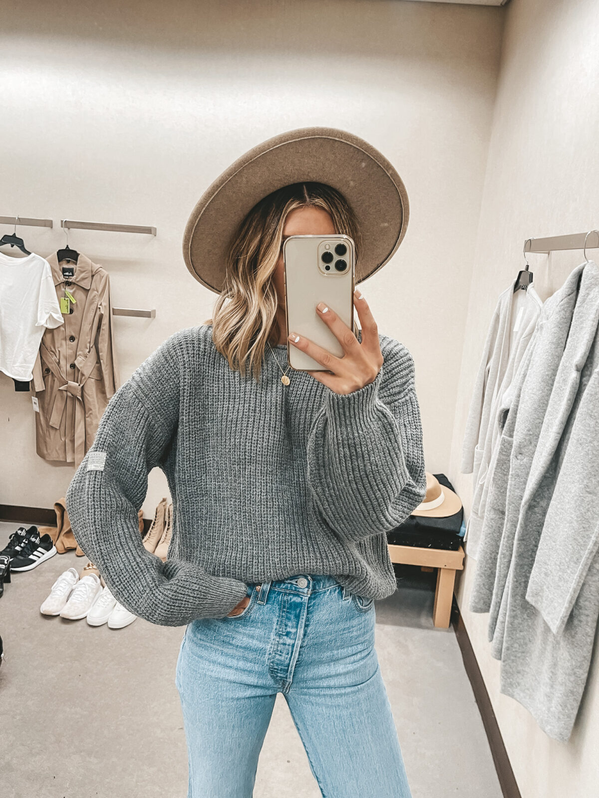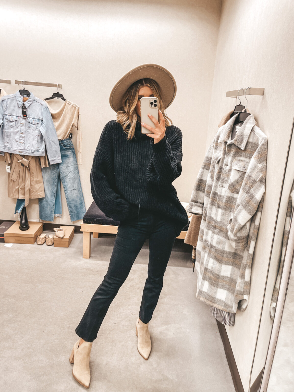 Other items pictured: Cardigan, Jeans, Boots, Booties, Hat, Bag, Earrings, Huggies, Marquise Necklace, Coin Necklace, Crescent Necklace