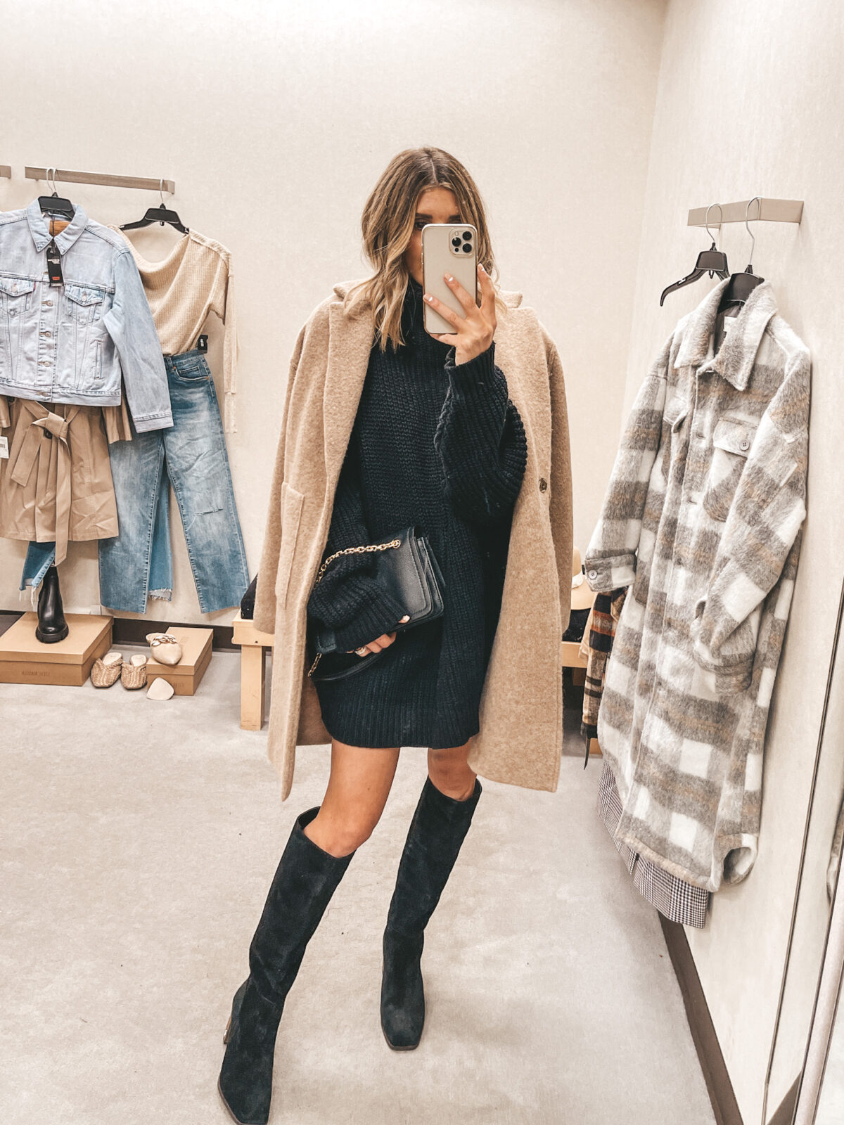 Other items pictured: Hat, Sweater Coat, Sam Edelman Knee High Suede Boots, Earrings, Huggies, Marquise Necklace, Coin Necklace, Crescent Necklace