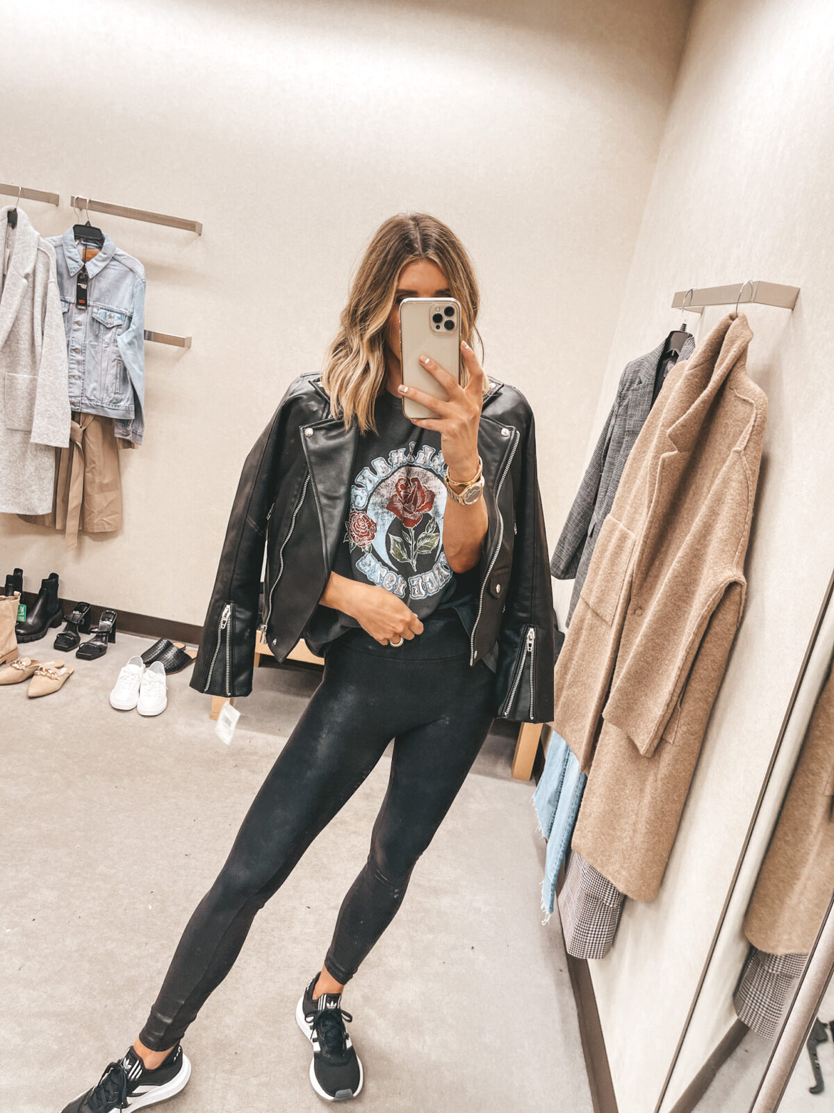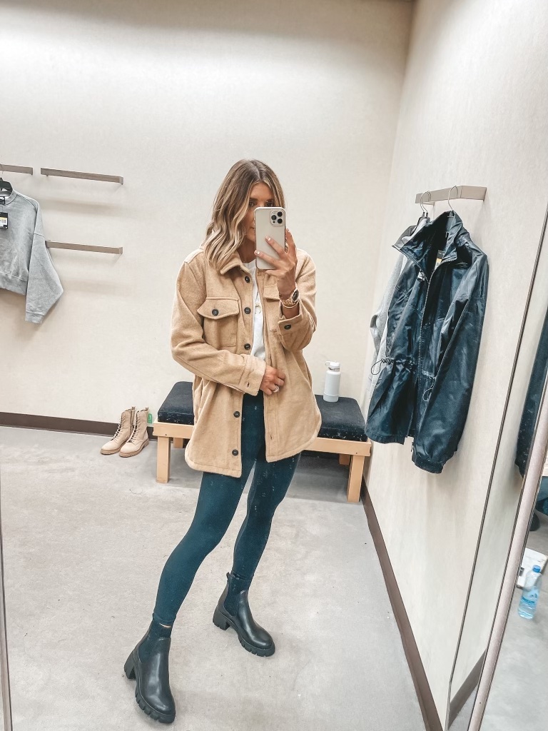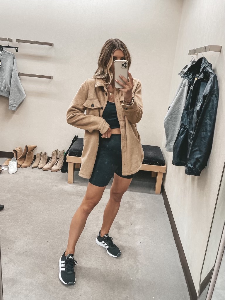 Other items pictured: Leggings, Workout top, Sports Bra, Black Jacket, Tan Shacket, Biker Shorts, Earrings, Huggies, Marquise Necklace, Coin Necklace, Crescent Necklace