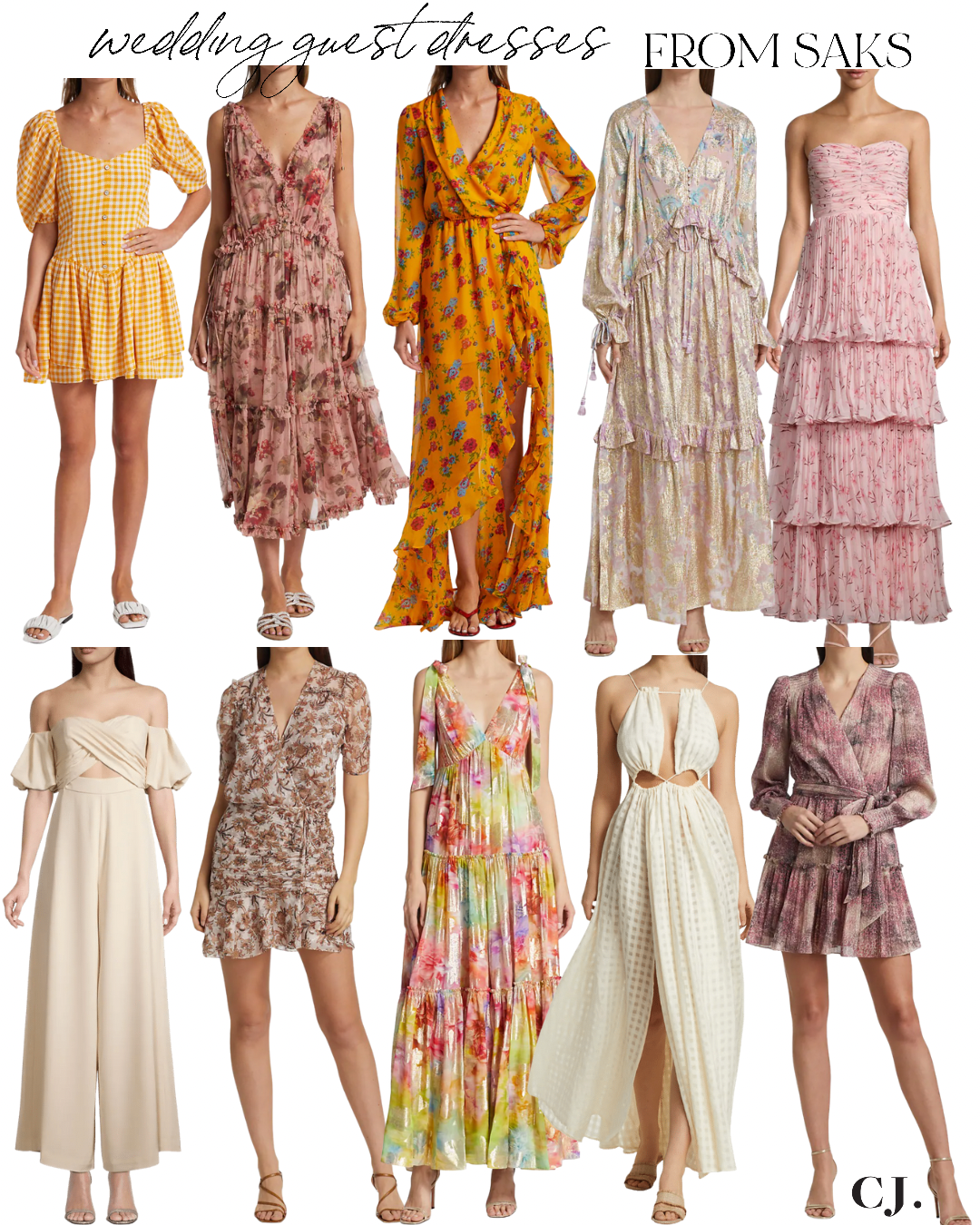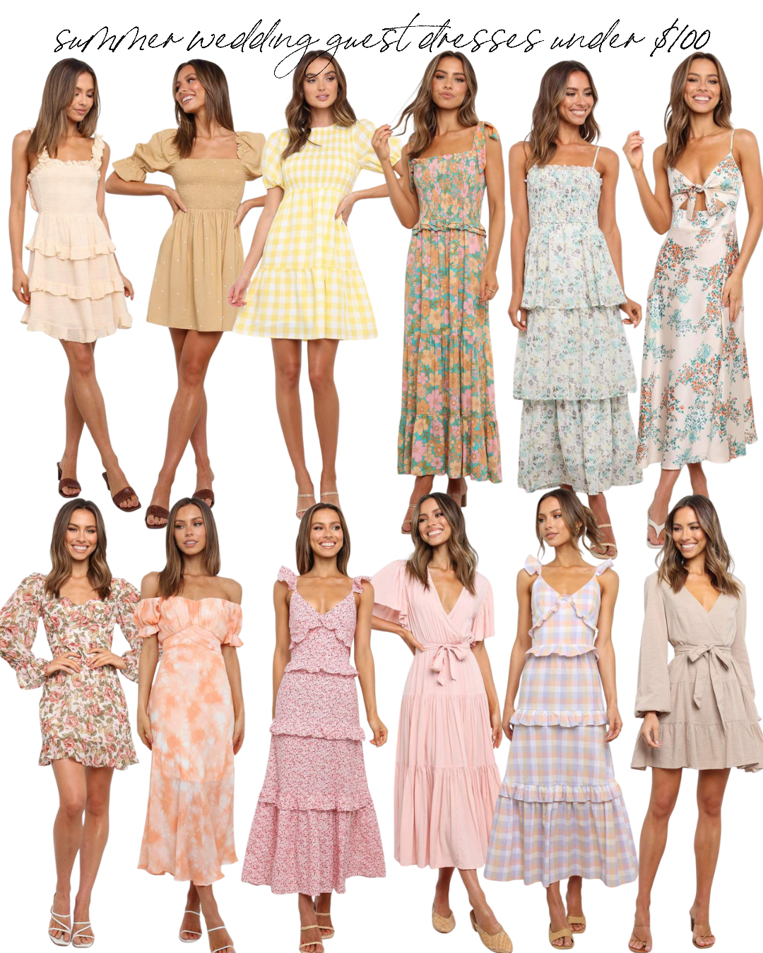 Yellow gingham // Pink midi // Orange & yellow maxi // Long sleeve purple maxi // Pink strapless maxi // Jumpsuit // Neutral floral mini // Bright colored maxi // White halter // Purple wrap mini