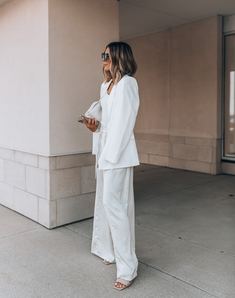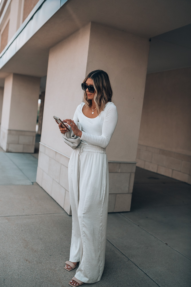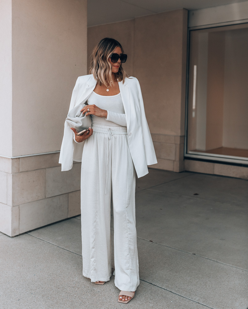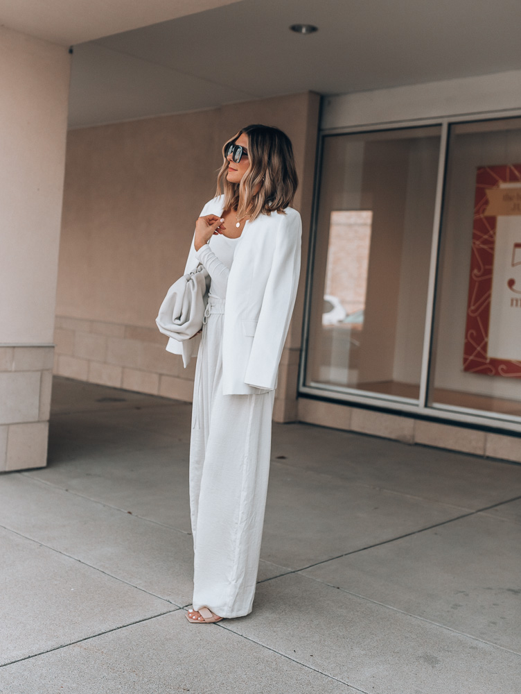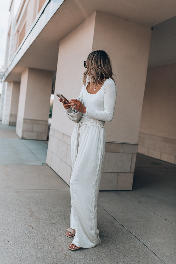 As a neutrals lover, I’m trying more and more to brighten up my fall and winter wardrobe with whites and creams and these new wide leg pants are a perfect wardrobe addition! They are lightweight, have a high rise fit and are elastic at the waist making them a perfect, timeless pant. I paired them with a knit long sleeve tee and white blazer (similar) with nude heels (love this similar pair!) for a more dressy look. Perfect for special events or a night out. For more of an everyday kind of outfit, I’d wear the wide leg pants with this button down shirt, sandals and a great bag!