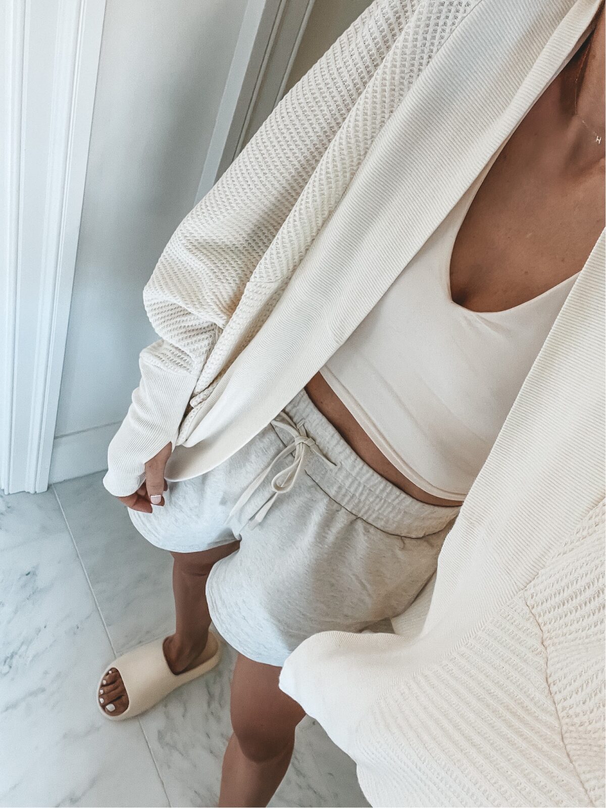 Biker shorts // Black hat // Tan hat // Black sports bra // Black leggings // Cheetah sports bra // Cheetah leggings // Tan button up jacket // Brown pullover // Black 3/4 zip jacket // Black pullover with ties at waist // Black joggers