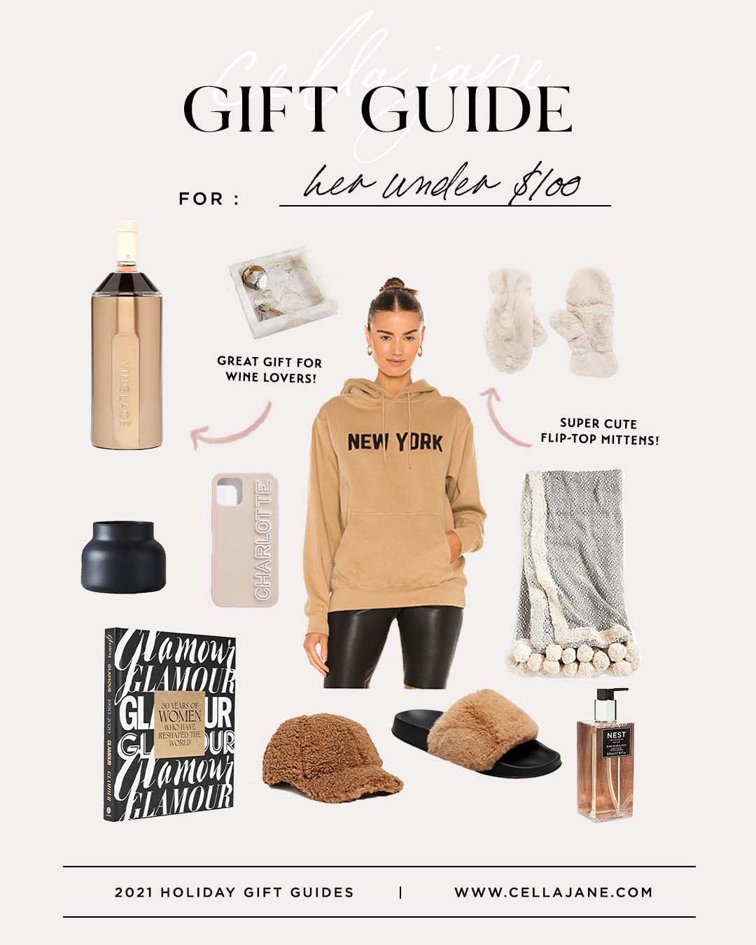 Wine bottle chiller // Catchall // Mittens // Candle // Phone Case // Sweatshirt // Blanket // Book // Hat // Sandals // Soap